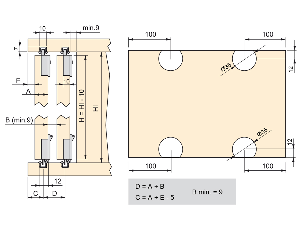 Montimi është i thjeshtë duke hapur një vrime me diamtër 35. Udhëzuesi i sipërm ka një grep me një sustë në mënyrë që ta zhvendosë poshtë dhe të lehtësojë montimin e derës në pjesën e fundit të mobiljeve.