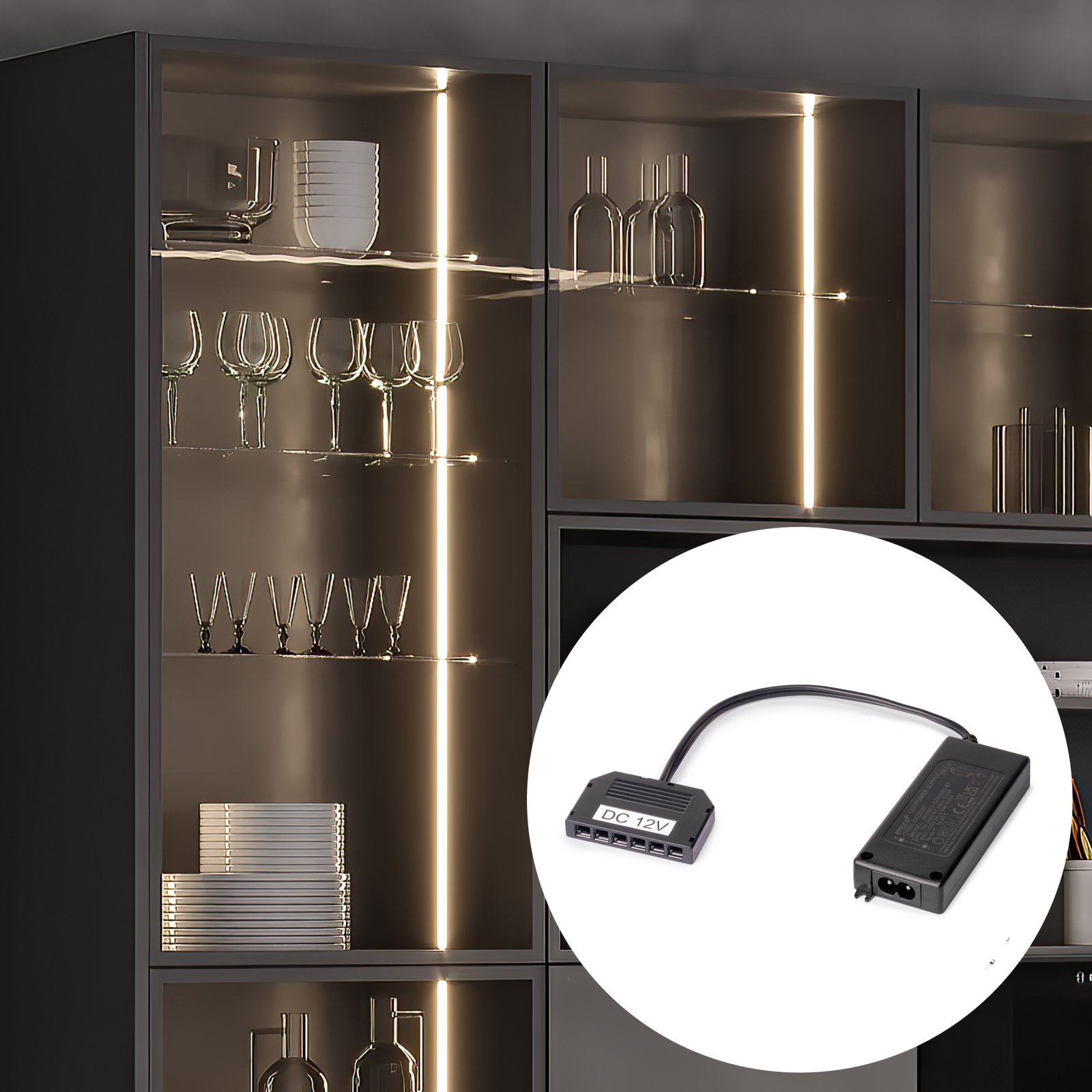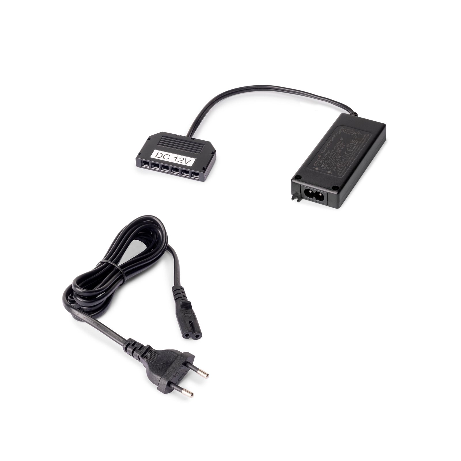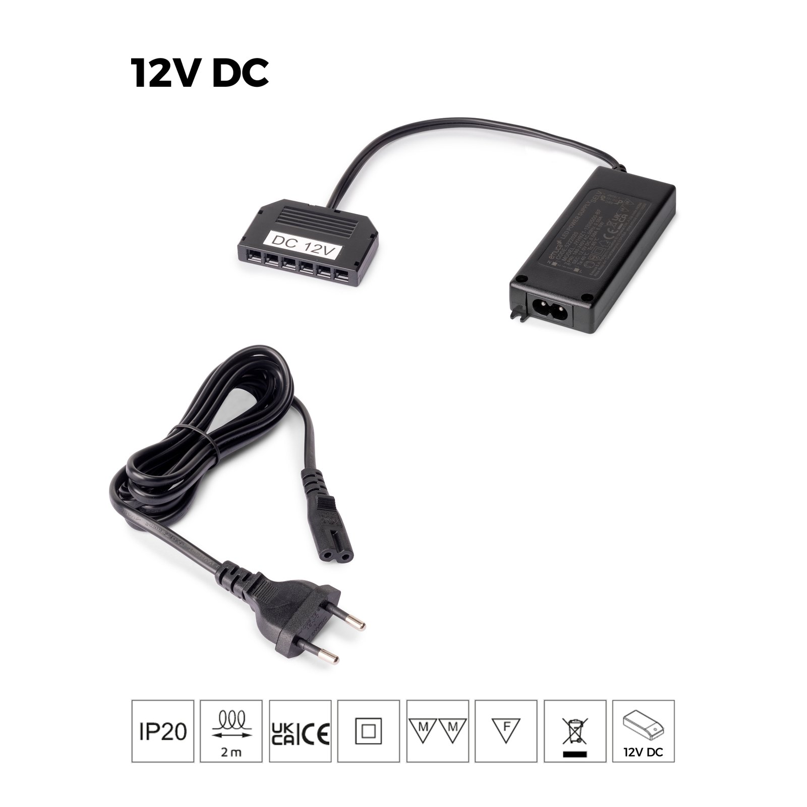 The constant-voltage converter 12V DC is designed for LED technology lights with constant voltage and it is characterised for its protection against overheating and short-circuits. It has an exchangeable cable , offering the possibility of connecting another cable to the converter with a different plug depending on the market that it is intended for. The housing is made from black plastic with class II protection, it has an 6-output MINILED distributor and a 2-metre power cable.