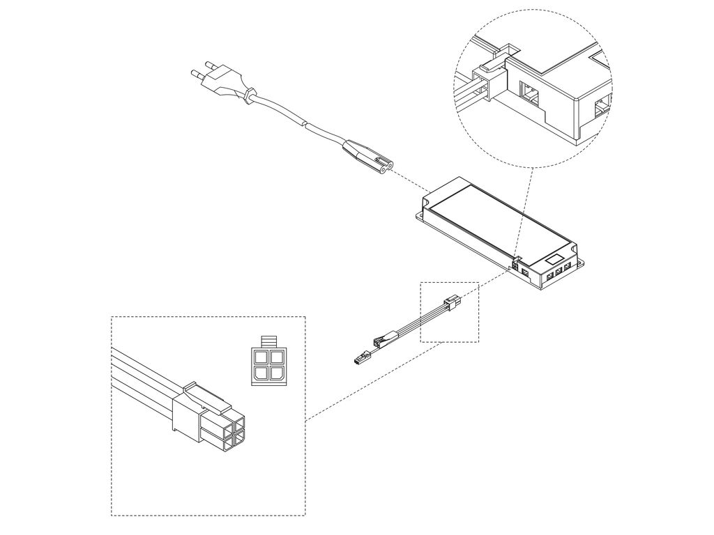 It can be easily concealed thanks to its reduced height, it also has 6 Miniled outputs and a 2m long power cable with a 90º angled Type C plug to prevent it from protruding from the socket and includes an IEC 60320 C7 connector at the other end. It is designed with a plastic (Polycarbonate) enclosure which provides the transformer with class II protection and features overheating and short circuit protection.