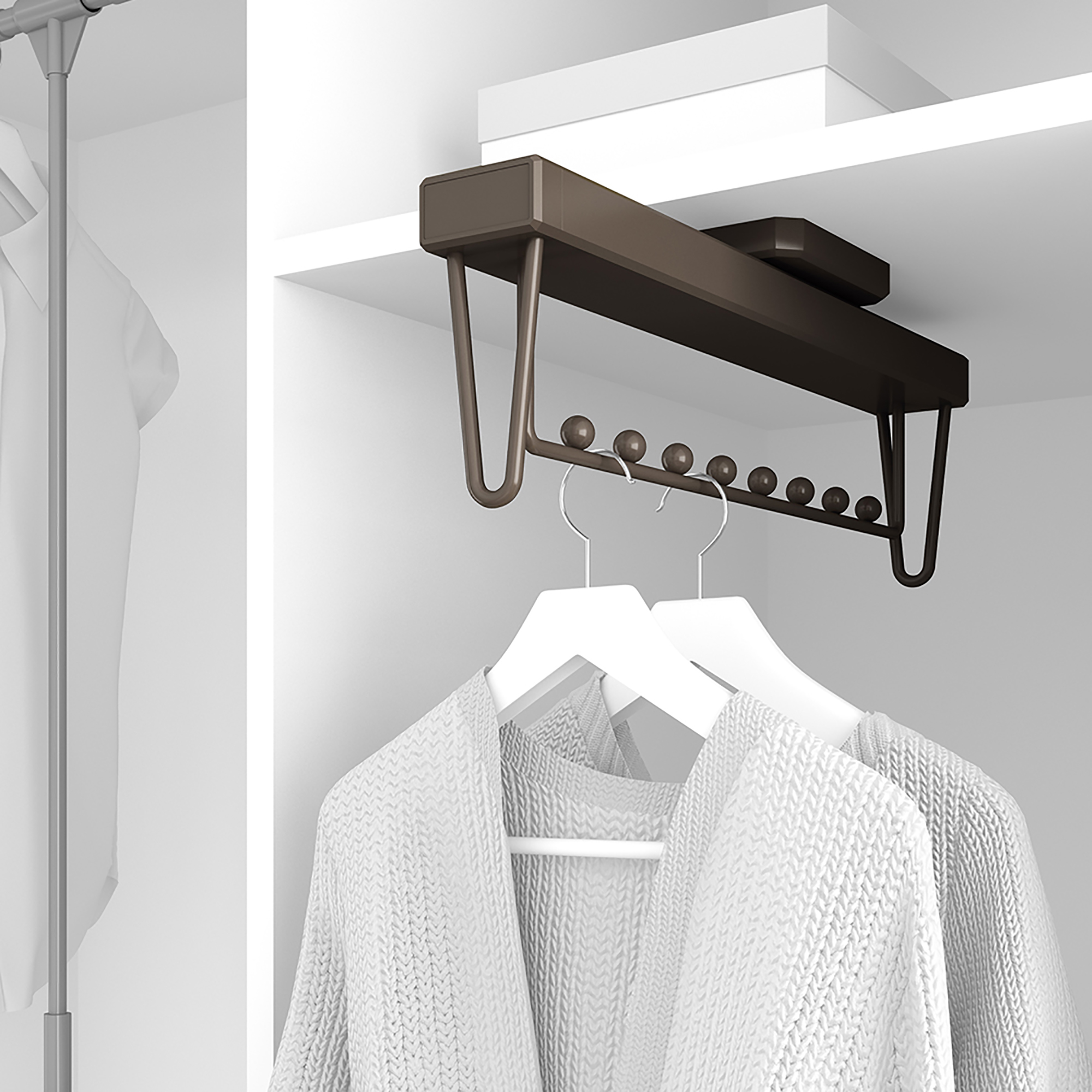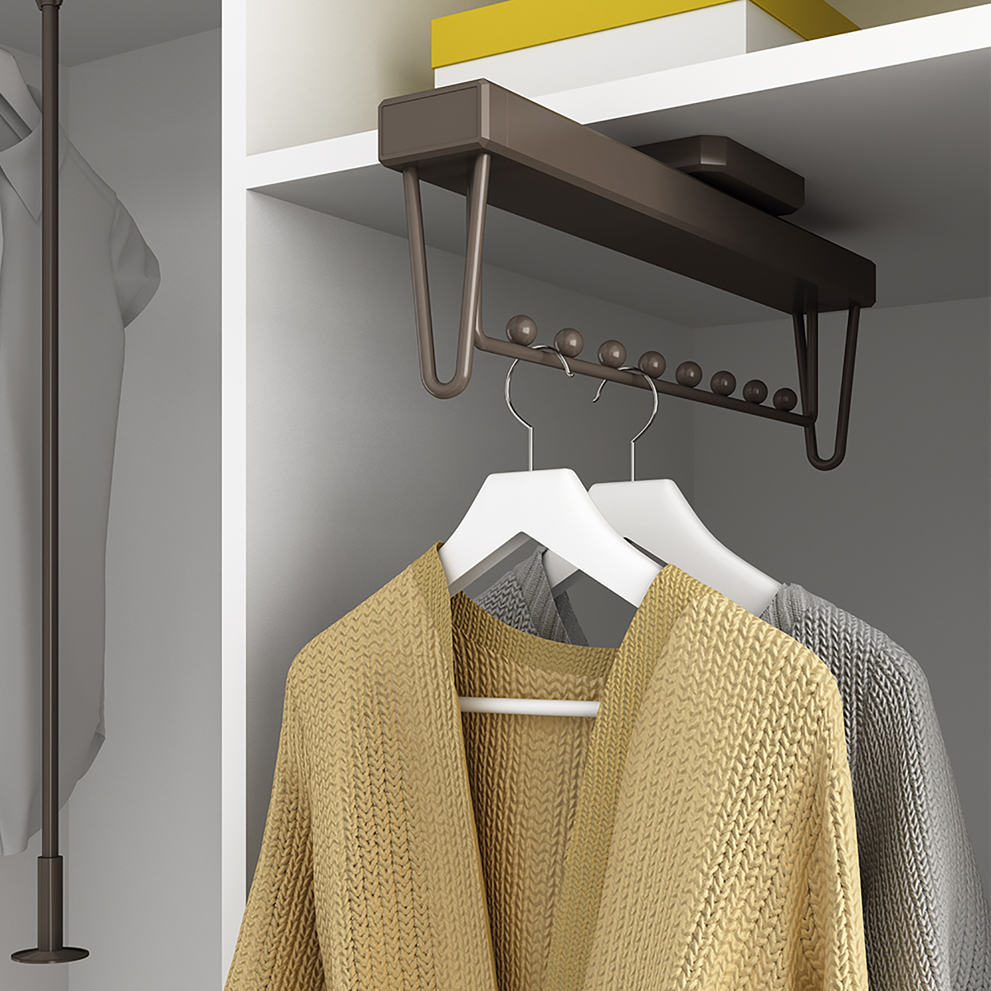 Varësja me dalje Moka për garderobë bën të mundur organizimin në mënyrë efikase të hapësirës brenda dollapëve dhe dhomave të zhveshjes, duke e bërë më të lehtë për të hyrë në varëse rrobash.Materiali alumin, me ngjyrë moka. Përfshin shina me mbyllje te butë