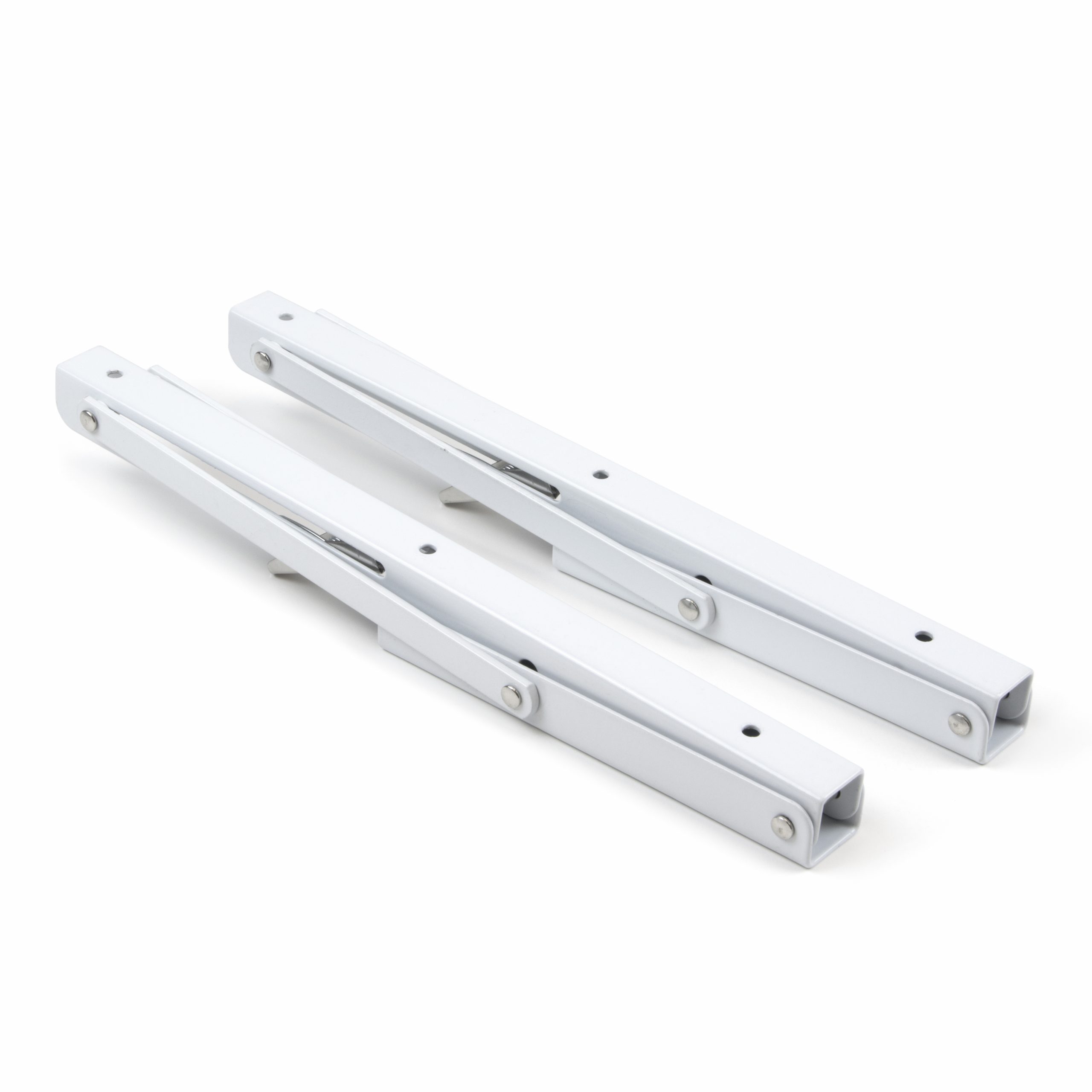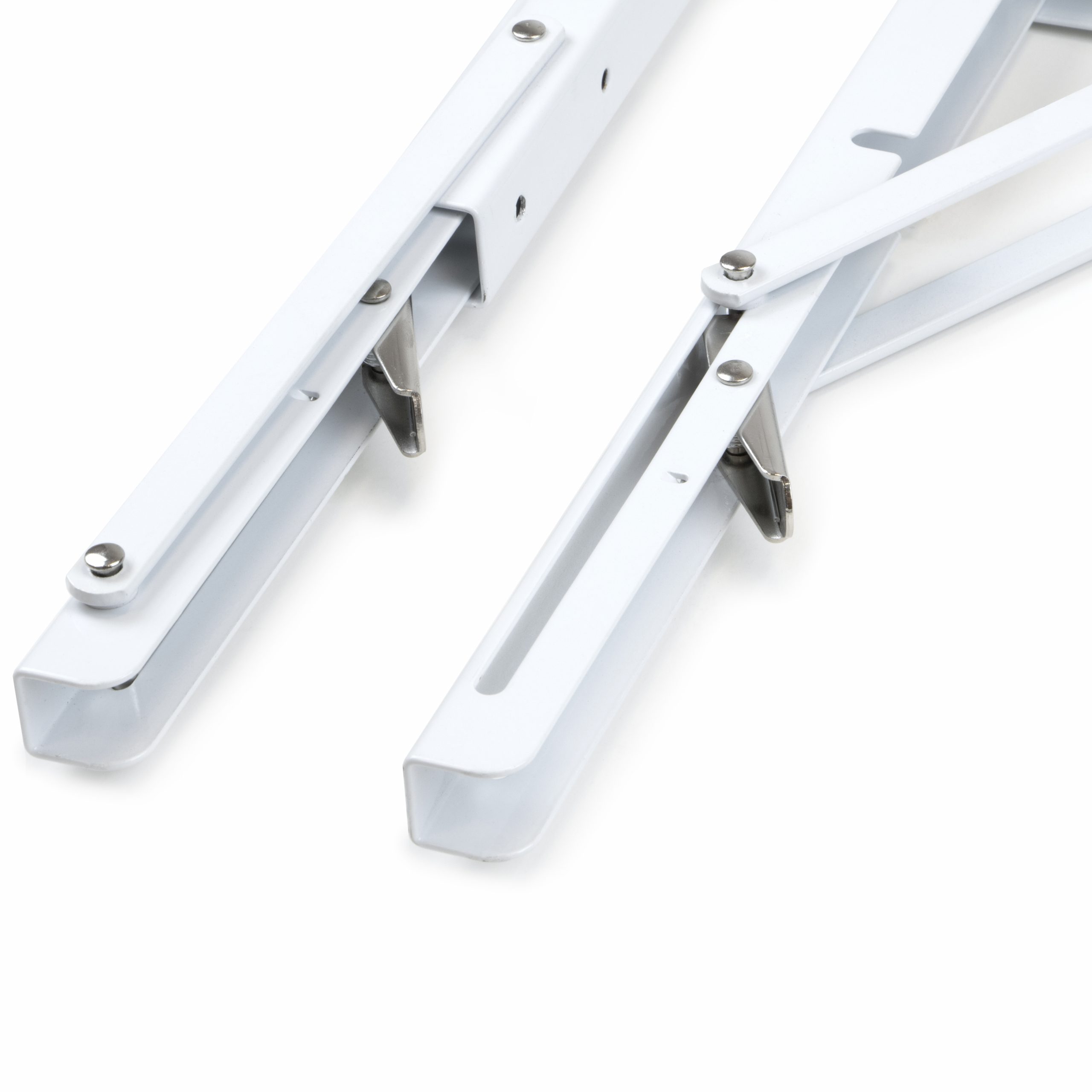 Set me 4 kllapa të palosshme për montimin e rafteve të varur në mur. Në dispozicion në madhësi prej 200 mm / 300 mm / 400 mm me një kapacitet maksimal ngarkese prej 40, 50 ose 60 kg për secilën raft me dy kllapa. Të lehta për tu montuar, këto kllapa të palosshme ju lejojnë të montoni rafte të palosshme për të përdorur çdo hapësirë. Ka butona që ju lejojnë t’i palosni ato dhe të aktivizoni sistemin e mbylljes që parandalon palosjen e kllapave aksidentalisht. Materiali çelik, me ngjyrë të bardhë. Paketimi përmban: 4 kllapa palosëse, 12 vida dhe 12 priza instalimi në mur dhe 12 vida druri për instalim në raftet që vendosni të përdorni.