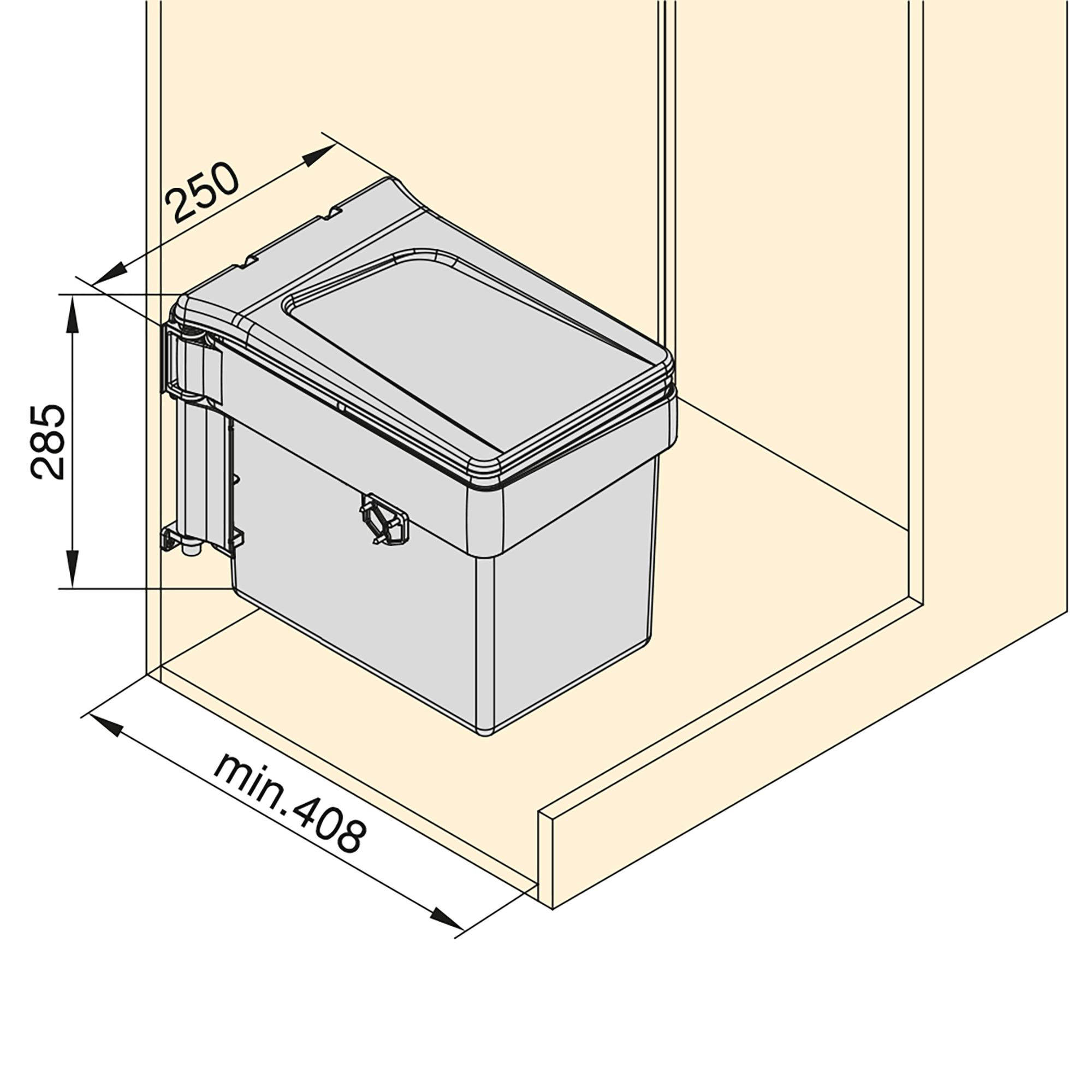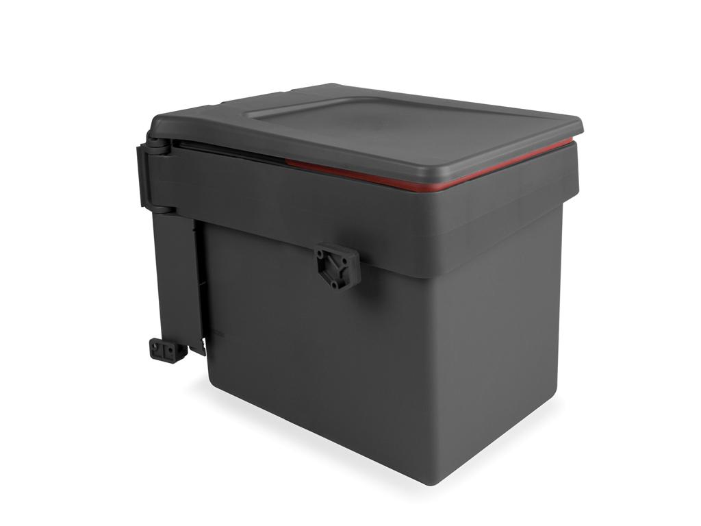 Materiali është plastik në ngjyrë gri antracid, ka një kapacitet prej 15 litrash dhe është shumë e lehtë për tu montuar brenda shumicës së mobiljeve të kuzhinës ose tualetit me një gjerësi minimale prej 408 mm. Mund të përdoret në dyer që hapen majtas ose djathtas.