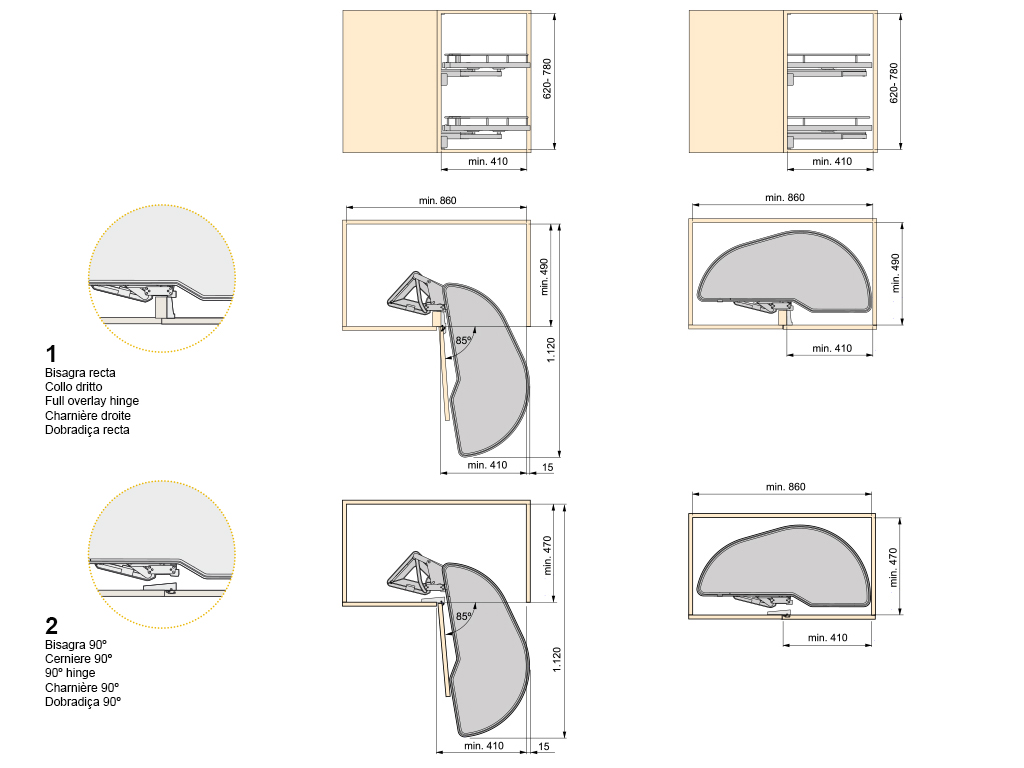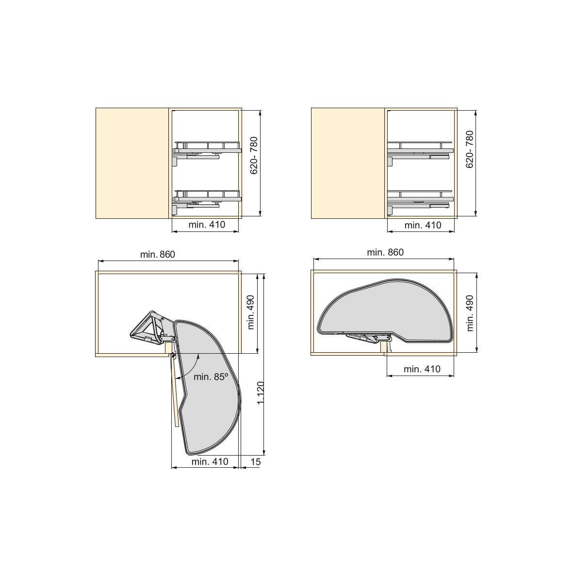 Për modul të ulët me një gjerësi minimale prej 900 mm dhe 450 mm dhe thellësi minimale të brendshme prej 490 mm.