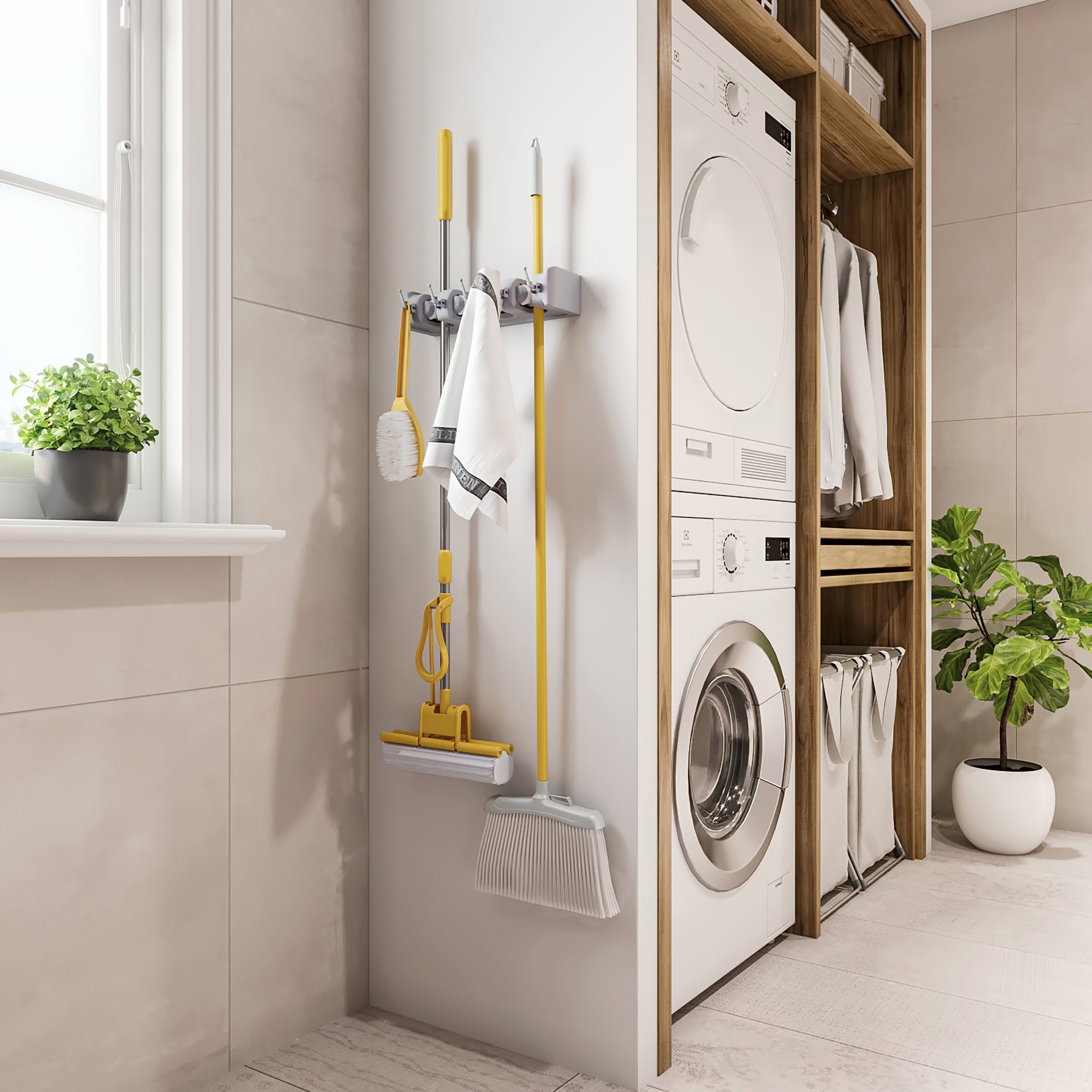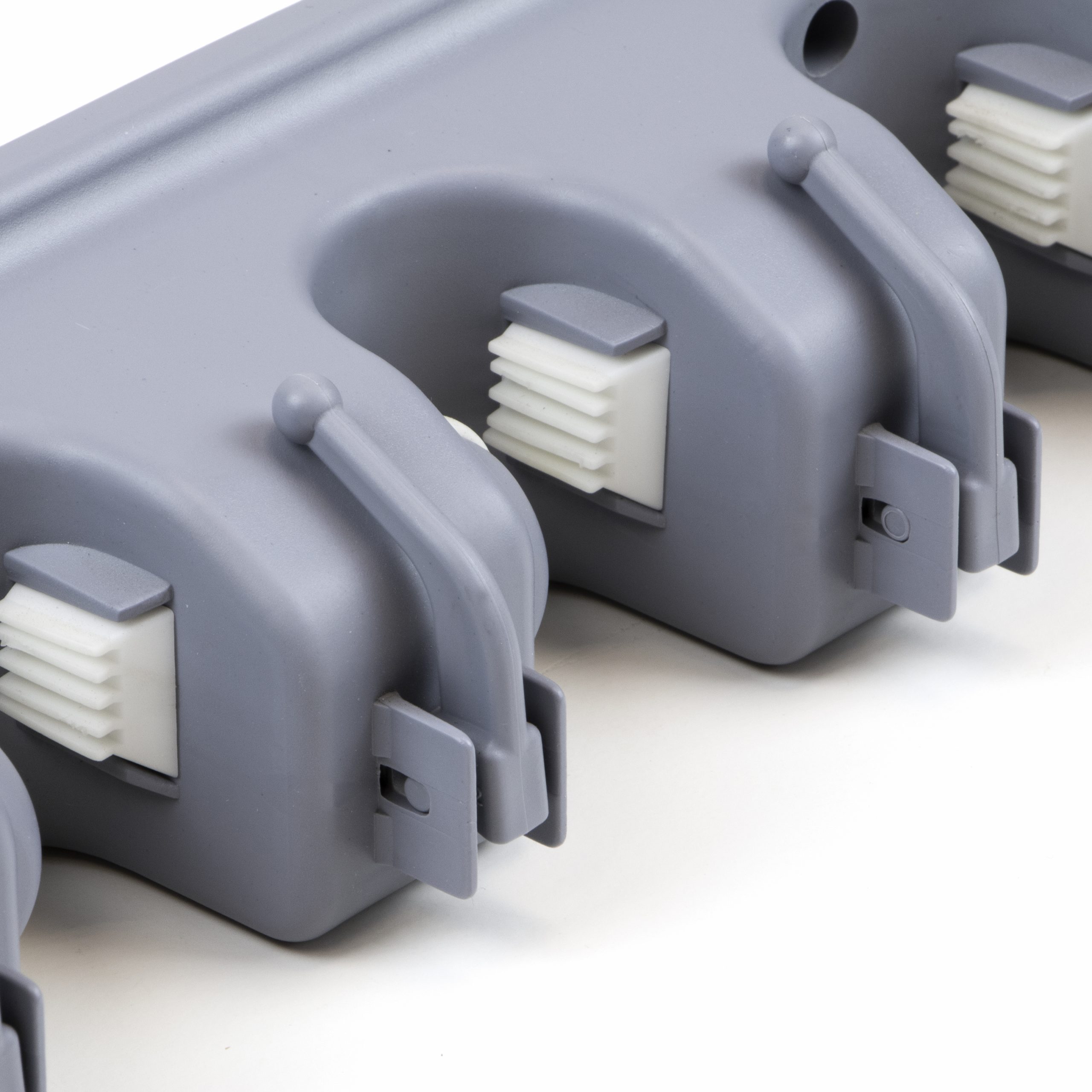 Varëse për pajisjet e pastrimit që ju mundëson të organizoni kuzhinën ose dhomën tuaj të magazinimit në mënyrë praktike dhe të kurseni hapësirë. Ideale për të varur fshesat, shtupat si dhe peshqirët e kuzhinës falë 4 hapsirave dhe 5 grepave. Hapsirat kanë rrota që përshtaten me trashësinë e dorezës së fshesës ose shtupë dhe i mbajnë ato të shtrënguara fort. Lëshimi i tyre është shumë i lehtë, thjesht ngrini lehtë dorezën e fshesës. Montohet shumë lehtë, me vida të përfshira. Materiali plastik, me një rezistencë të lartë, në ngjyrë gri.
