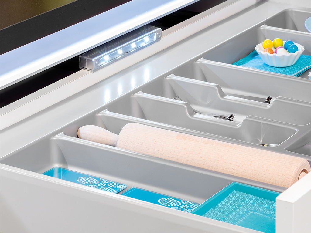 Organizues sitari, për sirtarët universalë të kuzhinës me një dizajn të drejtë dhe kapacitet të madh për ruajtjen e enëve të kuzhinës, duke shfrytëzuar plotësisht hapësirën. Duke qenë se mund të pritet, mund të përdoret me sirtarë të montuar në module me gjerësi standarde midis 400 mm dhe 900 mm, thellësi midis 450 mm dhe 500 mm me spesor midis 16 mm dhe 19 mm në varësi të modelit të zgjedhur.