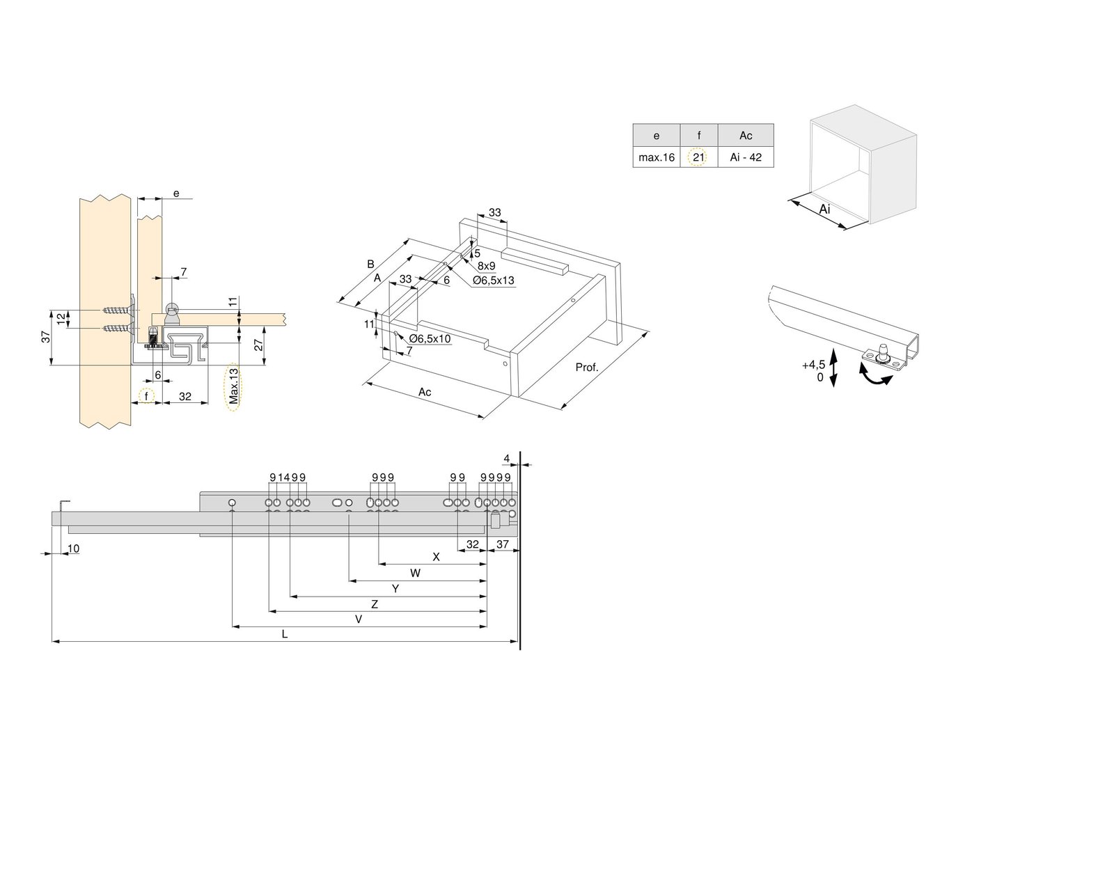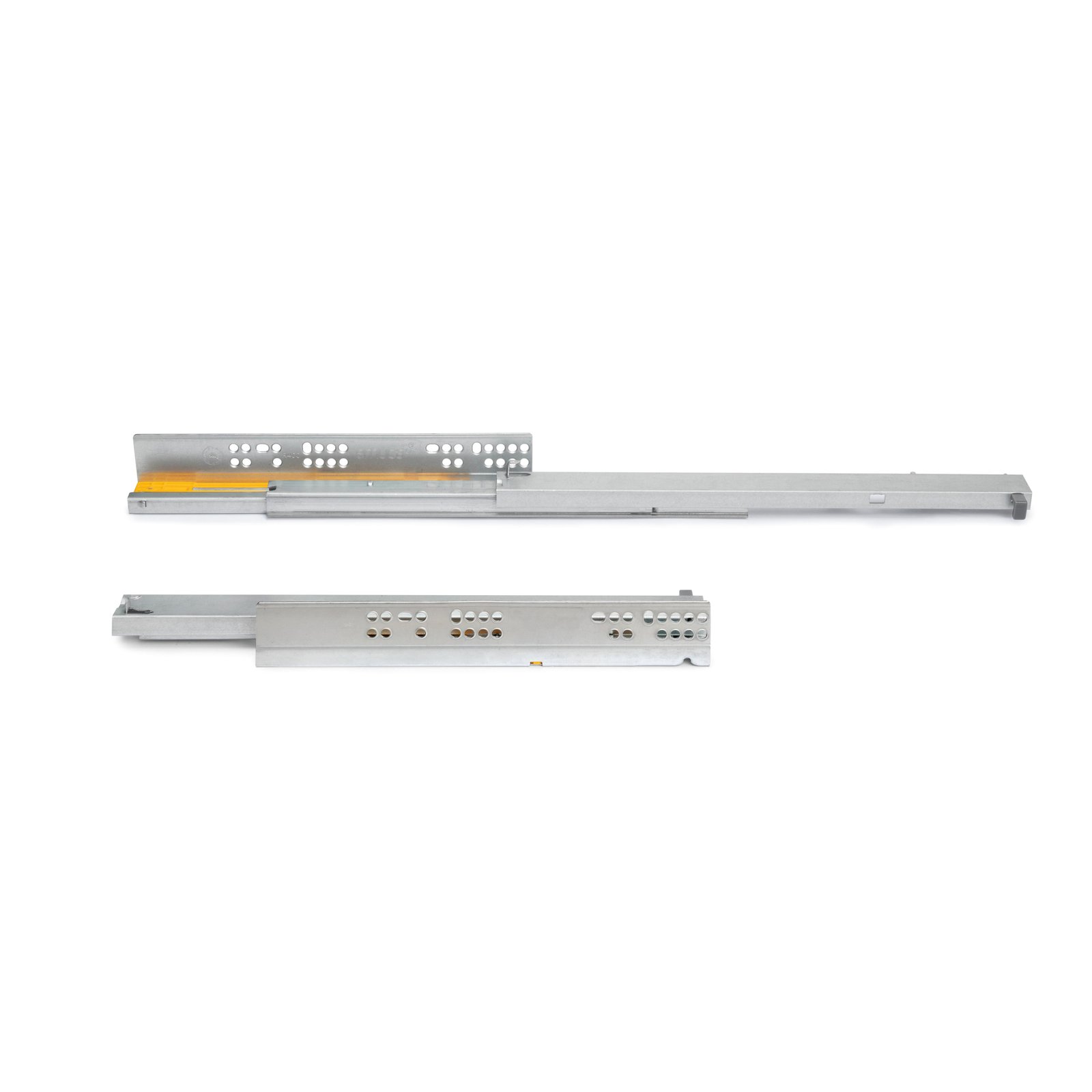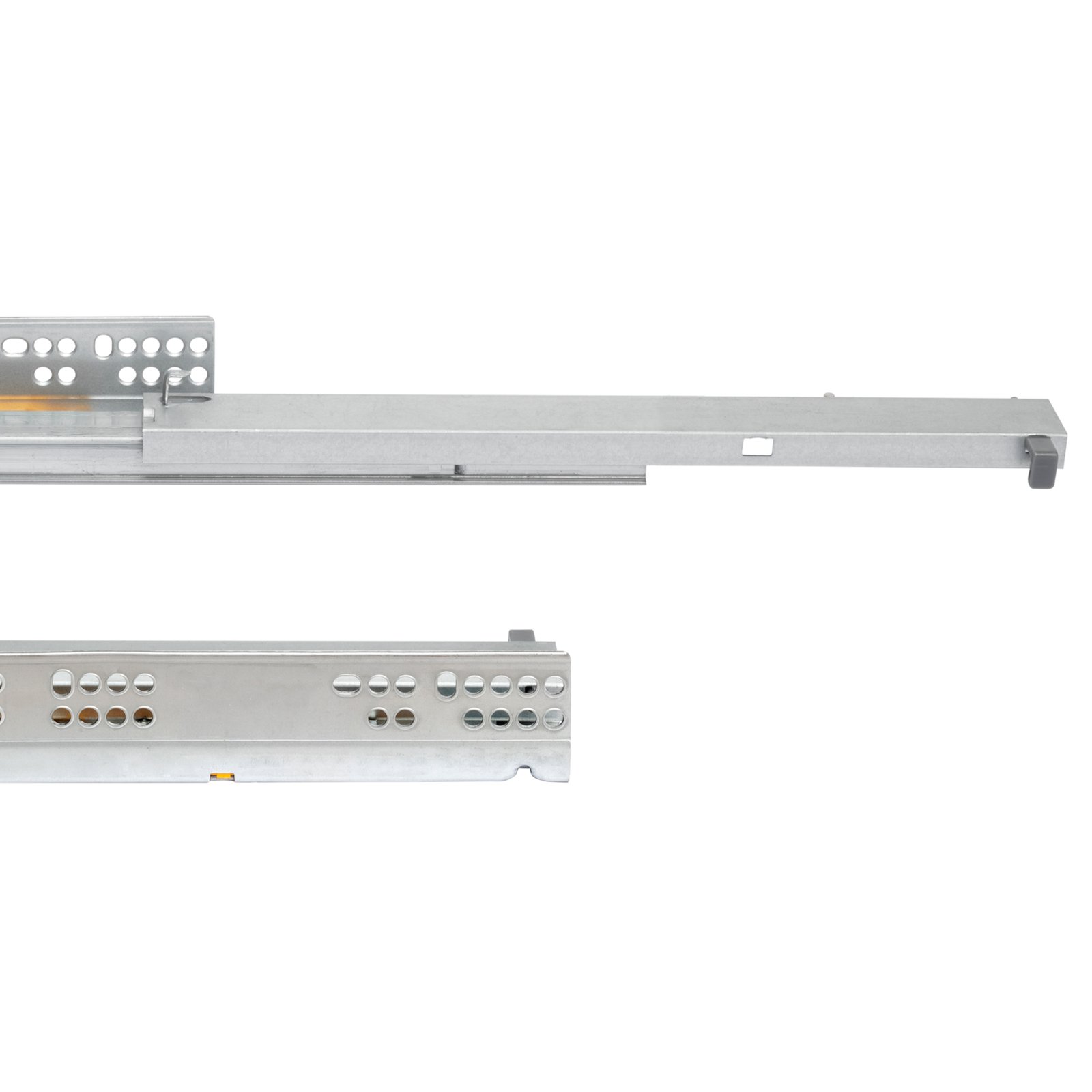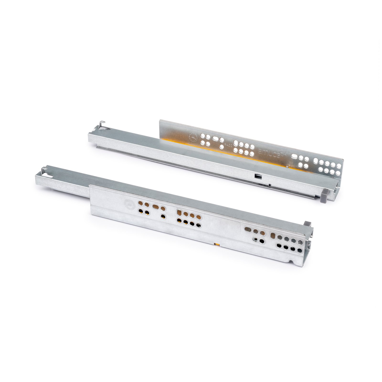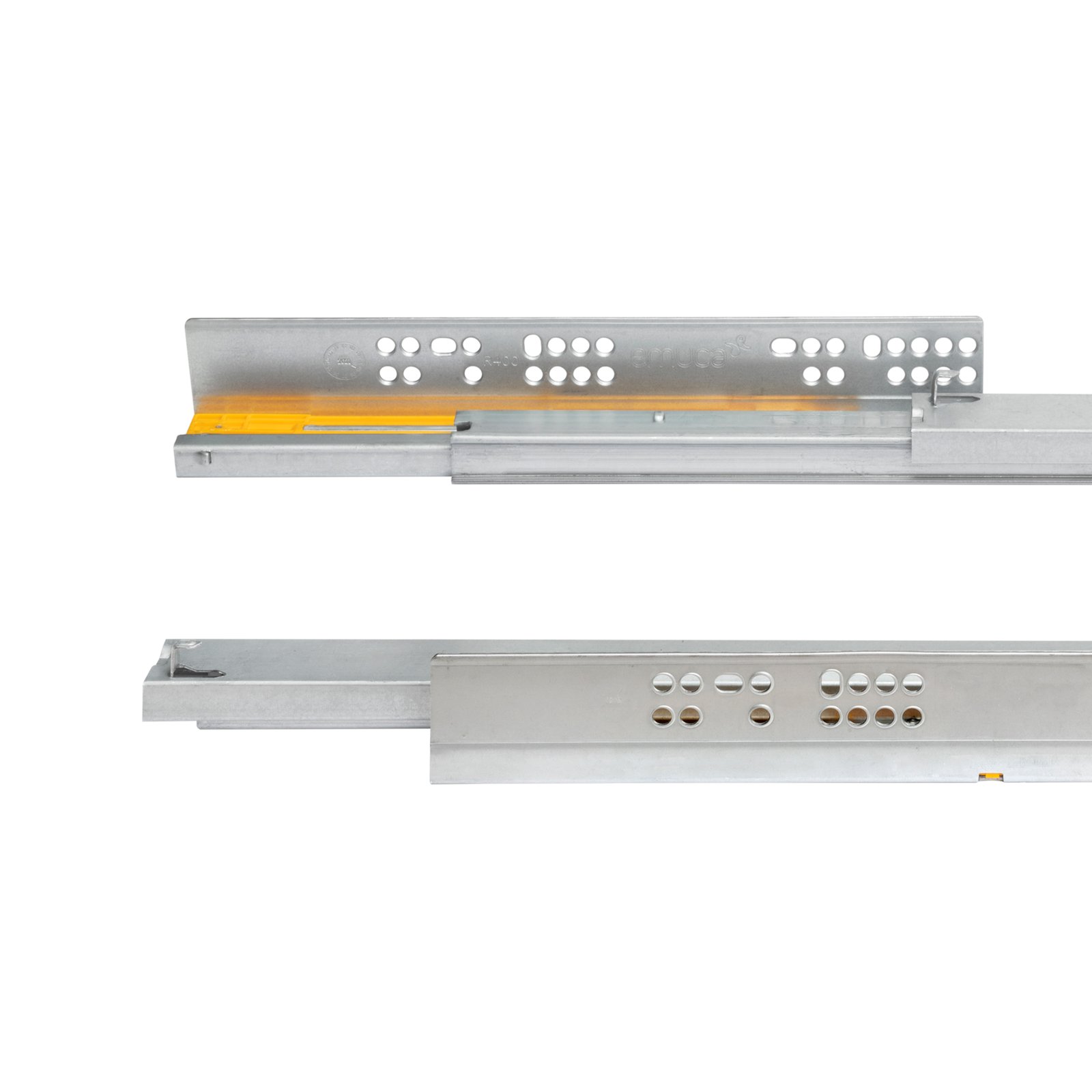 The total extraction and soft closing hidden runners for Silver drawers are ideal for fitting out your furniture with high quality at the best price. They stand out for their functioning and the soft closing of the drawer, thanks to a cushioning piston on both runners. They also have a locking pivot mounted on the runner itself in order to prevent the drawer from involuntarily disassembling. They are made from steel and have smooth and silent sliding thanks to their high-quality delrin ball bearings, that allow for horizontal and vertical adjustment.
