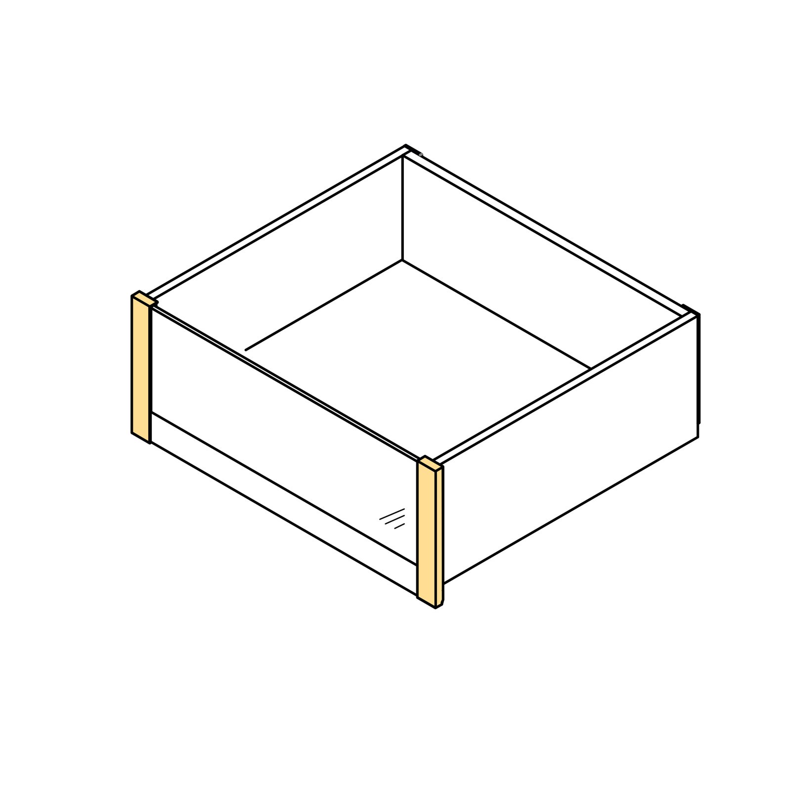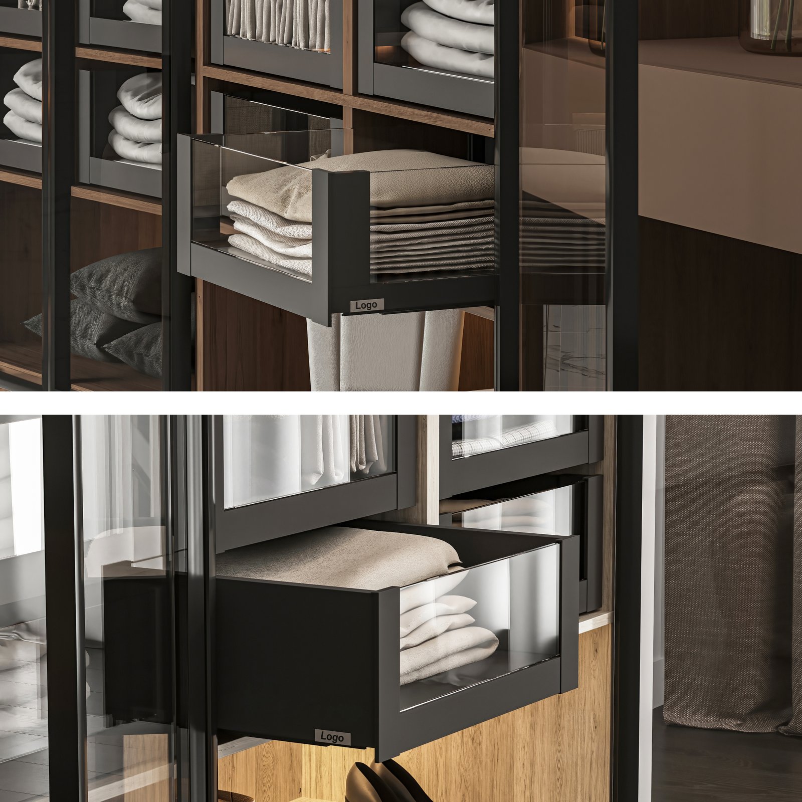 For assembly you need to purchase the specially designed aluminium front profile for these accessories, the 6 mm thick glass front panel is not included. In addition, it is compatible with Vertex drawers with glass sides and metal sides. Suitable for module widths up to 1200 mm.