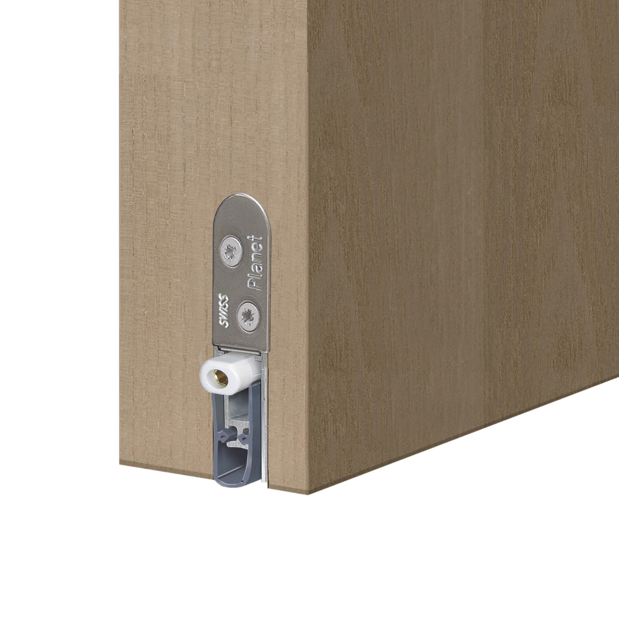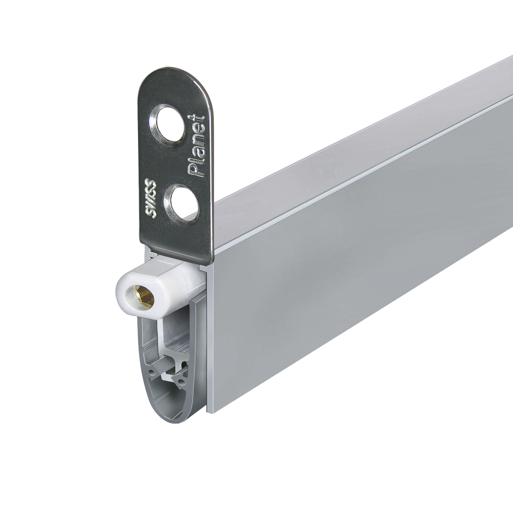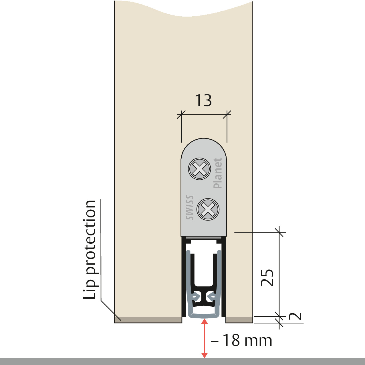 Automatic door drop-down seal Planet KT RD | 48 dB, for sound and smoke-shielding protection doors, hinge-side triggering with automatic compensation for sloping floors, parallel lowering, seal height up to 18 mm, flush or deeper with lip protection for grooving. Silicone lip, side attachment. Profile made of aluminium 13 x 25 mm.