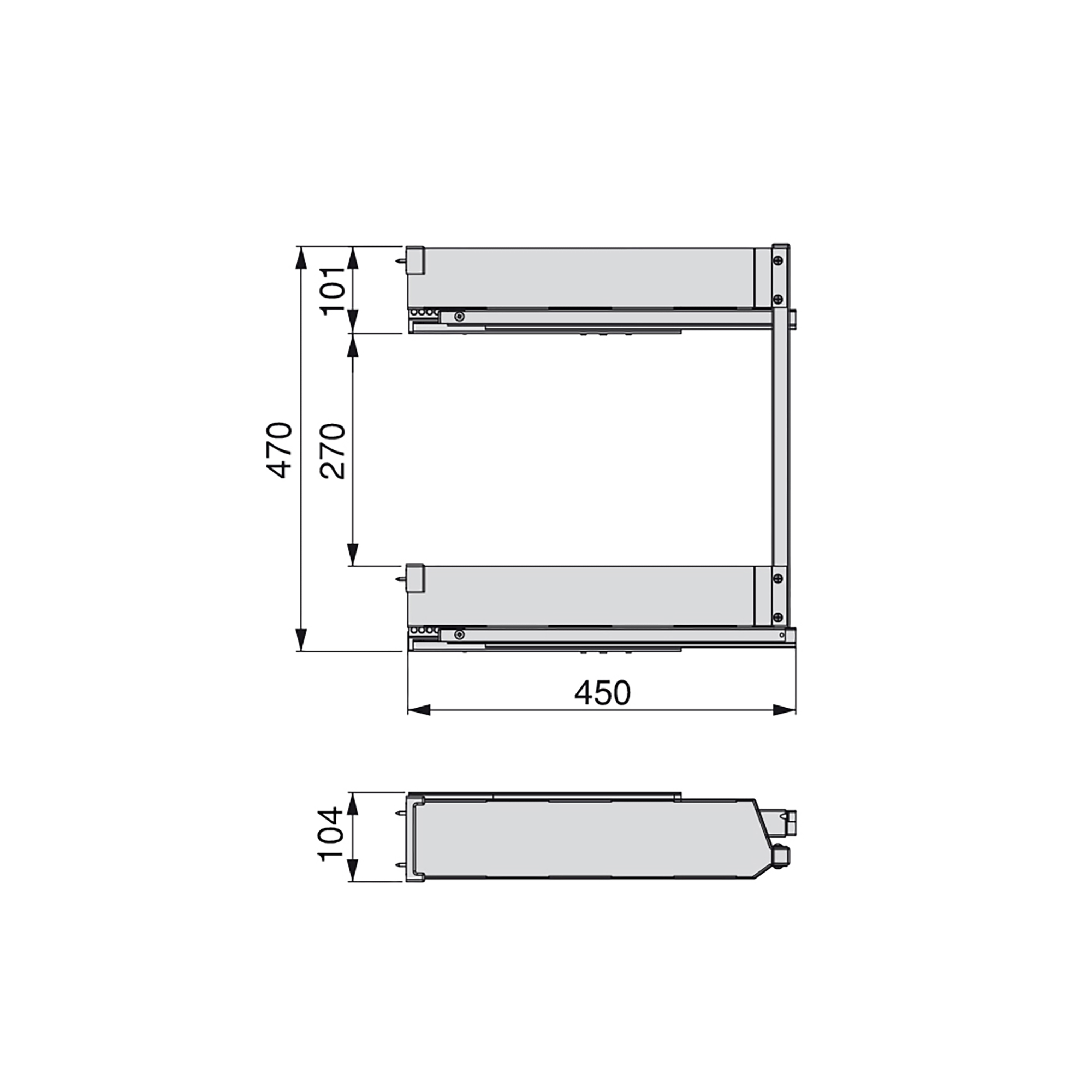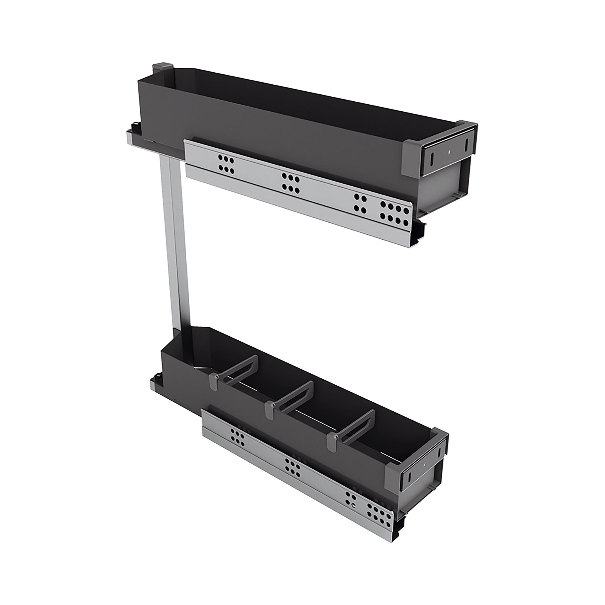 Struktura e bërë nga faqe metalike me fund gri antracit me dy nivele / rafte dhe rrëshqitje të plotë shtrirëse me mbyllje të butë të cilat sigurojnë një dalje të butë të sistemit. Ngarkesa maksimale deri në 25 kg (12,5 kg për raft).