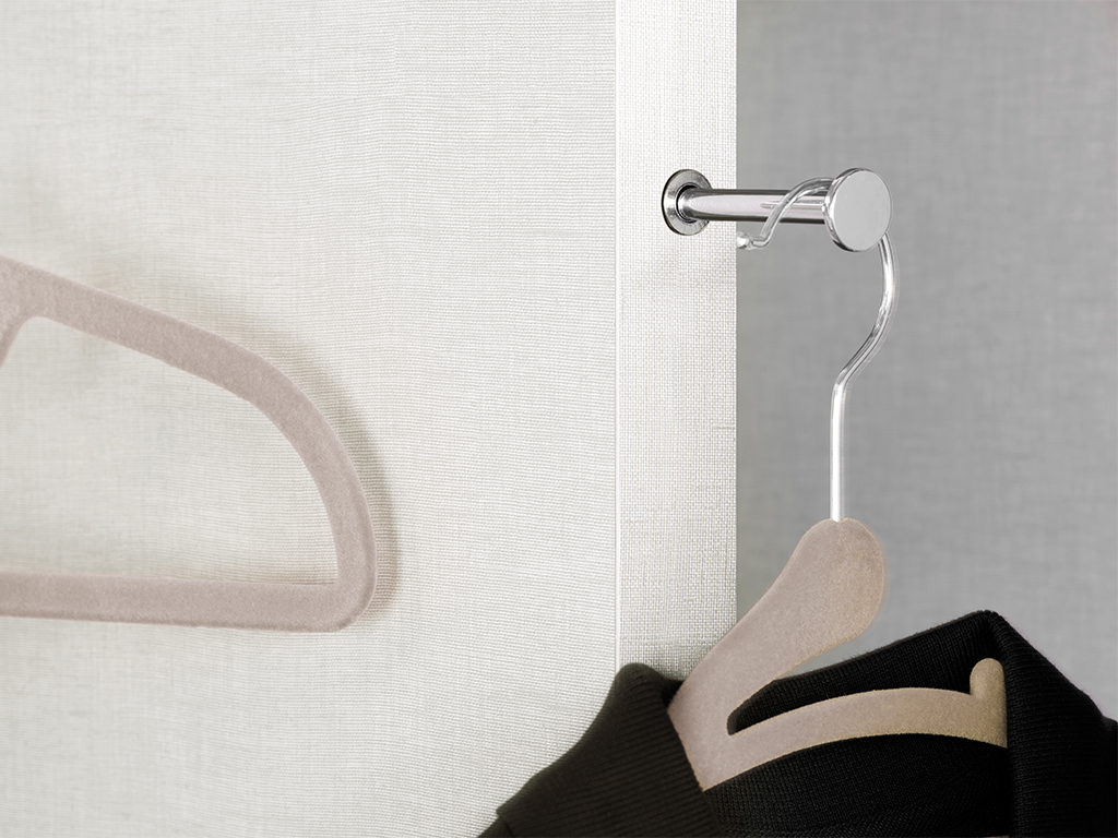 Garment hanger made entirely of stainless steel for added strength, with a chrome finish for added elegance. It has a vertical dimension of 110.8 mm x a diameter of Ø 20 mm. The part that is installed inside the wall or plank has a vertical dimension of 105 mm and a diameter of Ø 14.2 mm. When it is already installed and it is removed where the garments are hung, it reaches a vertical length of 168 mm. The packaging includes 1 unit of this removable hanger, with two lengths, folded: 110.8 mm and extracted: 168 mm