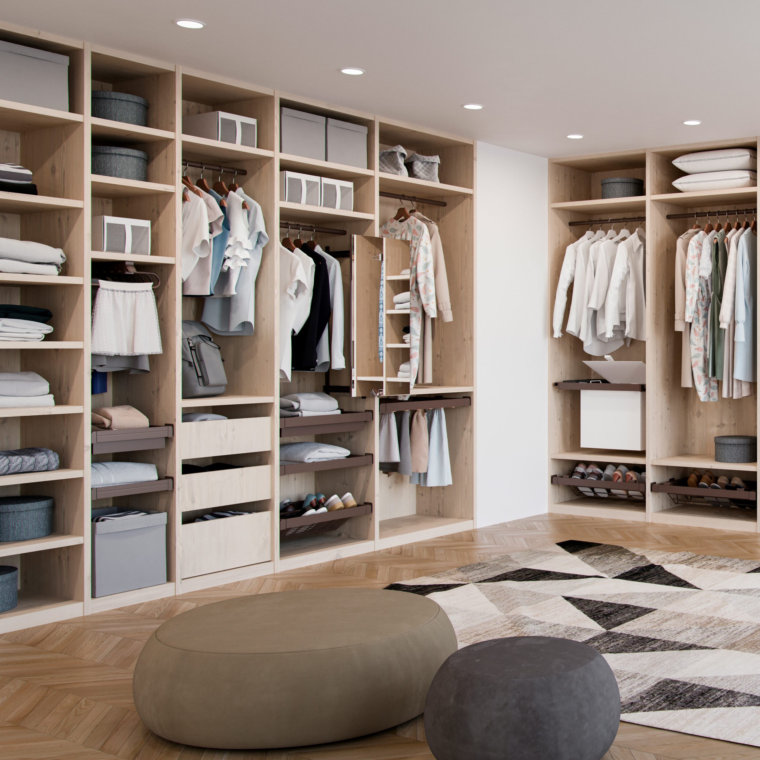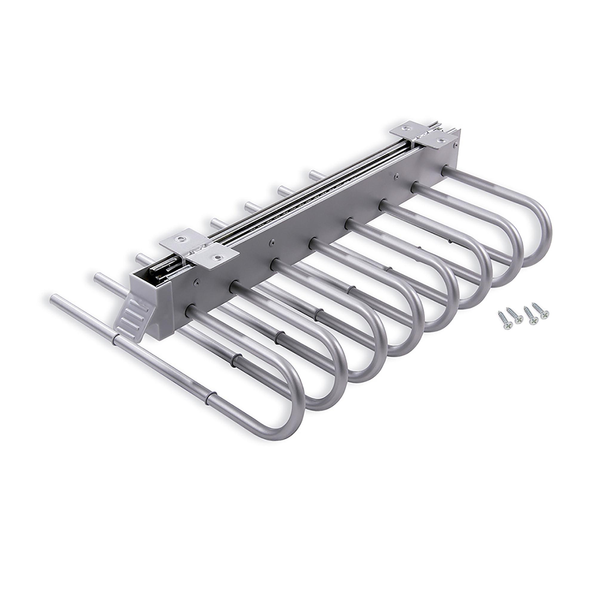 The lateral extractable trouser rack makes it possible to efficiently organise space inside wardrobes and dressing rooms, making it easier to access garments. It is made from steel with a painted aluminium and grey plastic finish, and has 450 mm total extraction runners. It has a built-in handle on the front part in order to facilitate extraction of the mechanism.