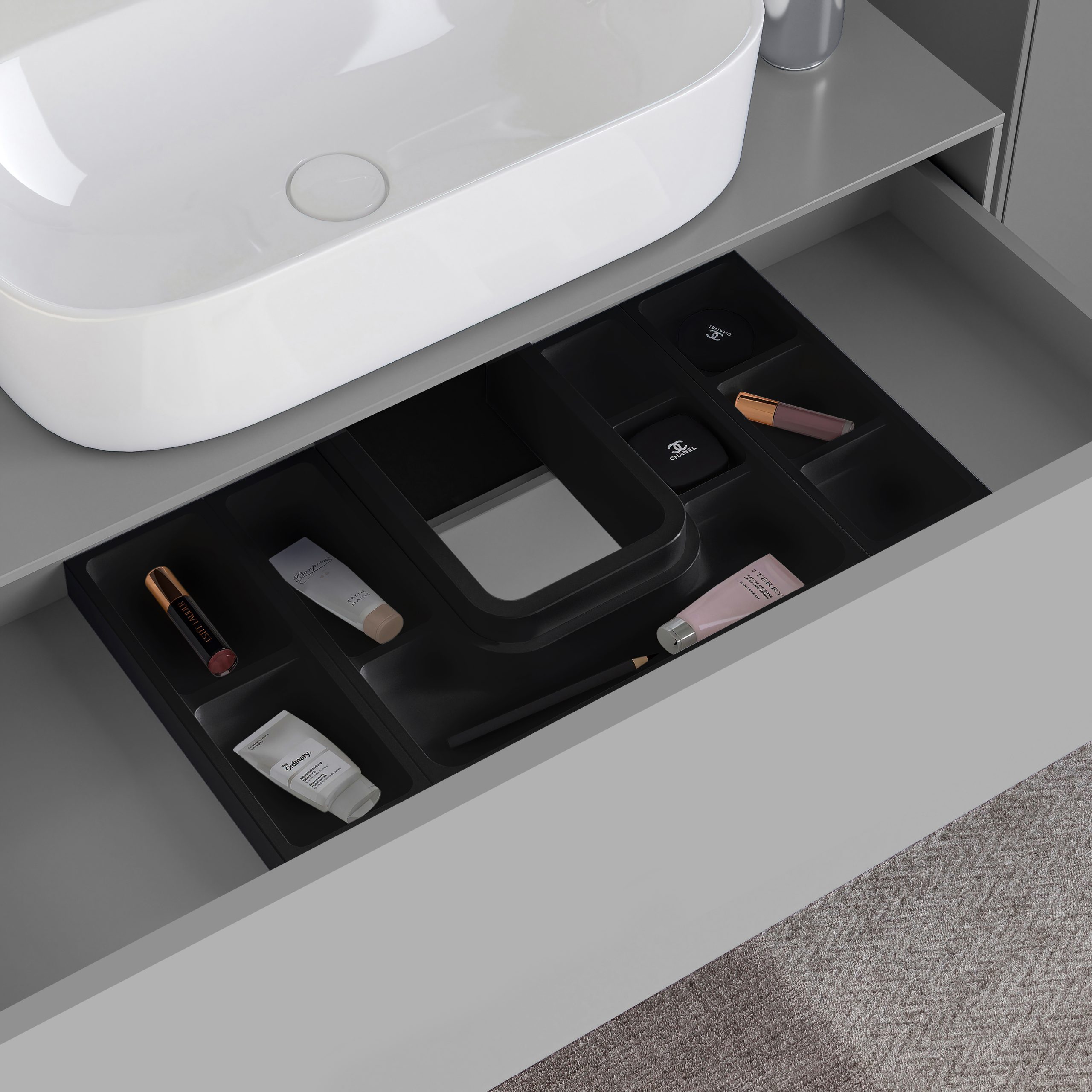 The organizer is designed to be installed together with the siphon saver in a bathroom drawer located under the sink, it has the function to classify and store your objects. It is suitable for any module width and can be mounted in drawers with a minimum depth of 350mm. The drawer organizer has a large storage capacity, is easy to clean and provides easy access to makeup tools, toiletries, jewelry, etc.