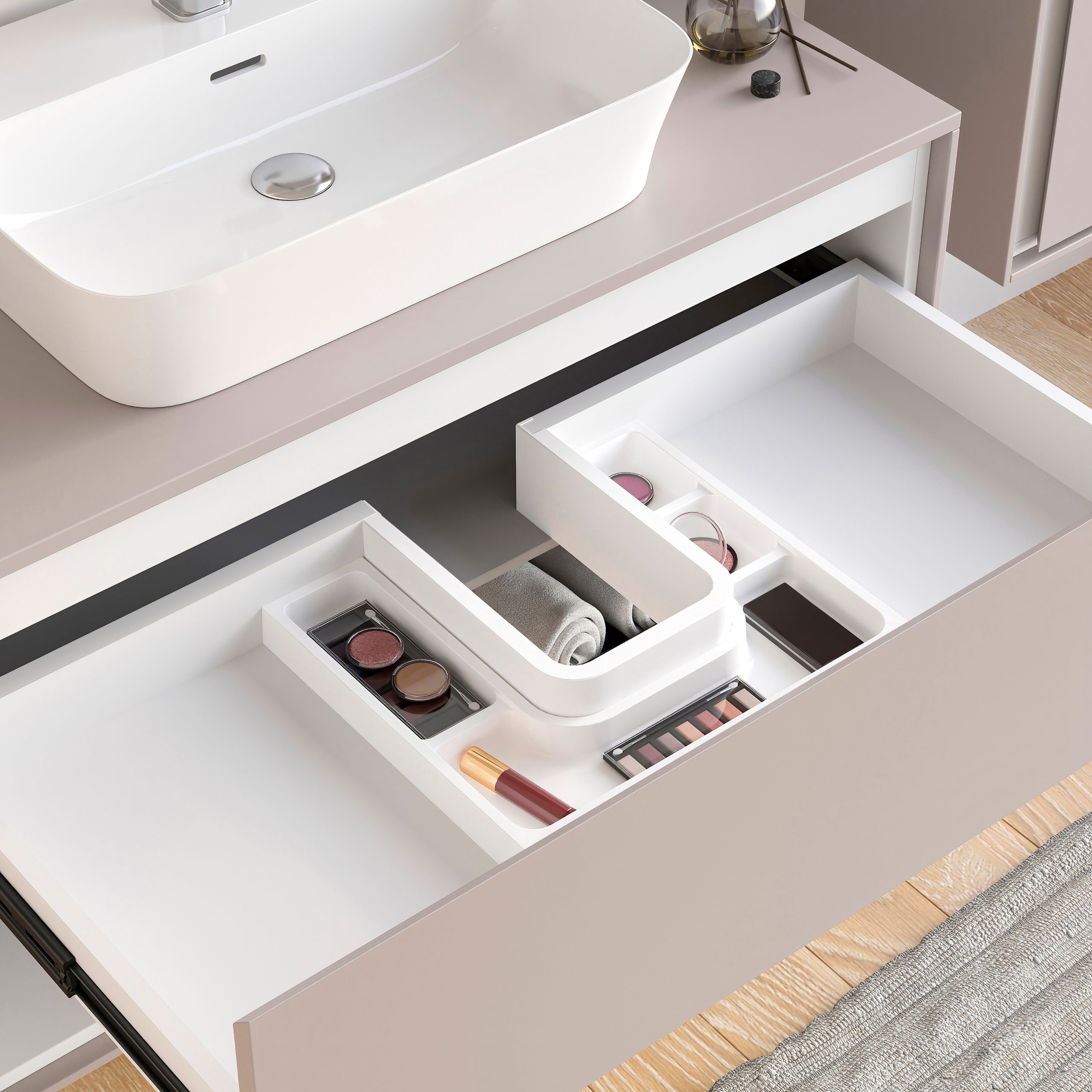 Discover the range of Tidy bathroom accessories, the perfect solution to make the most of the space inside your bathroom furniture and organize your cosmetics. They can be freely combined according to the size of the drawer you have, the siphon saver together with the drawer organizers and the Tidy bins.
