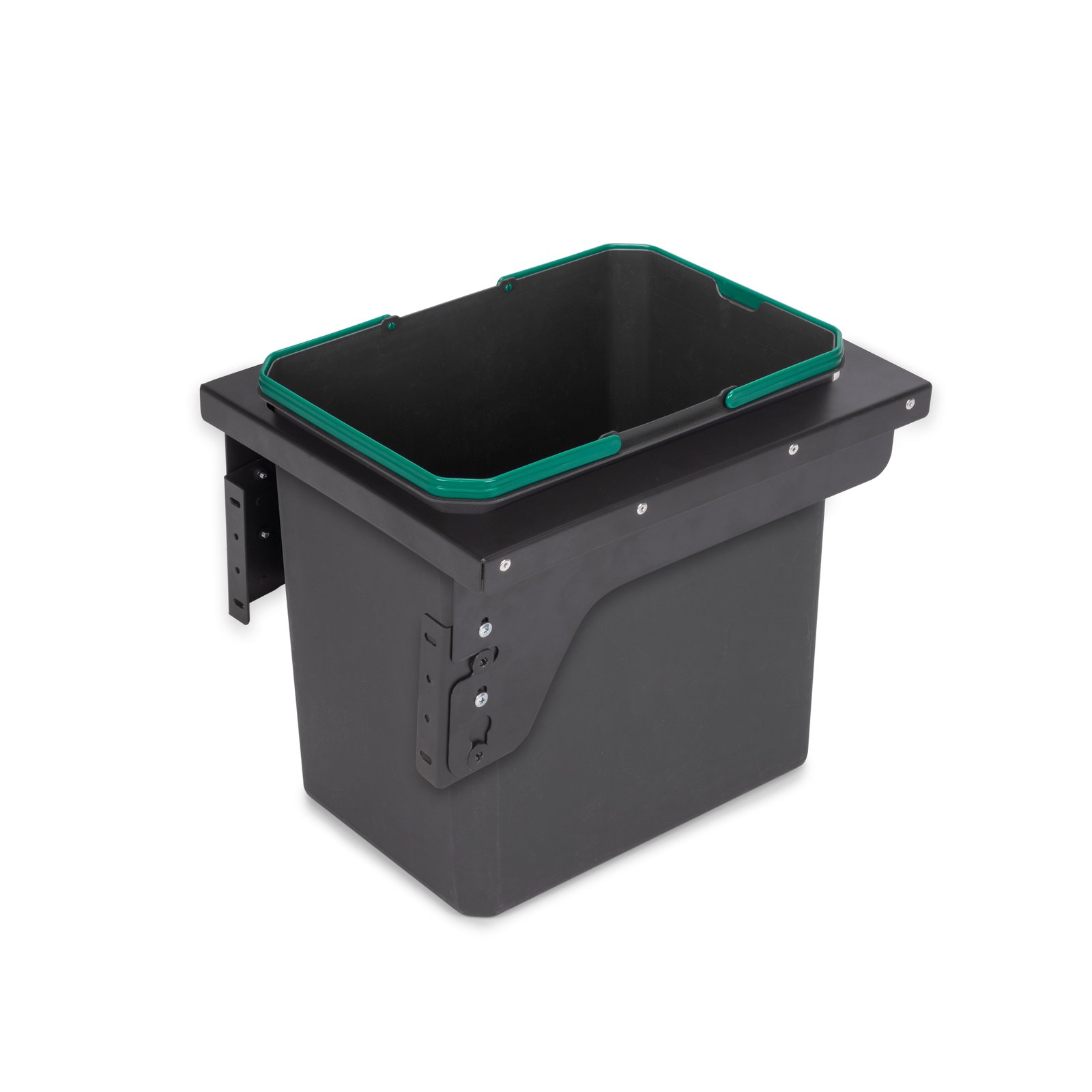 Removable manual pull-out recycling bin for 45 module, to be fixed to the side of the kitchen unit. Once installed in the unit, the bin is fully extractable when the front is opened, making it an excellent option for sorting waste.