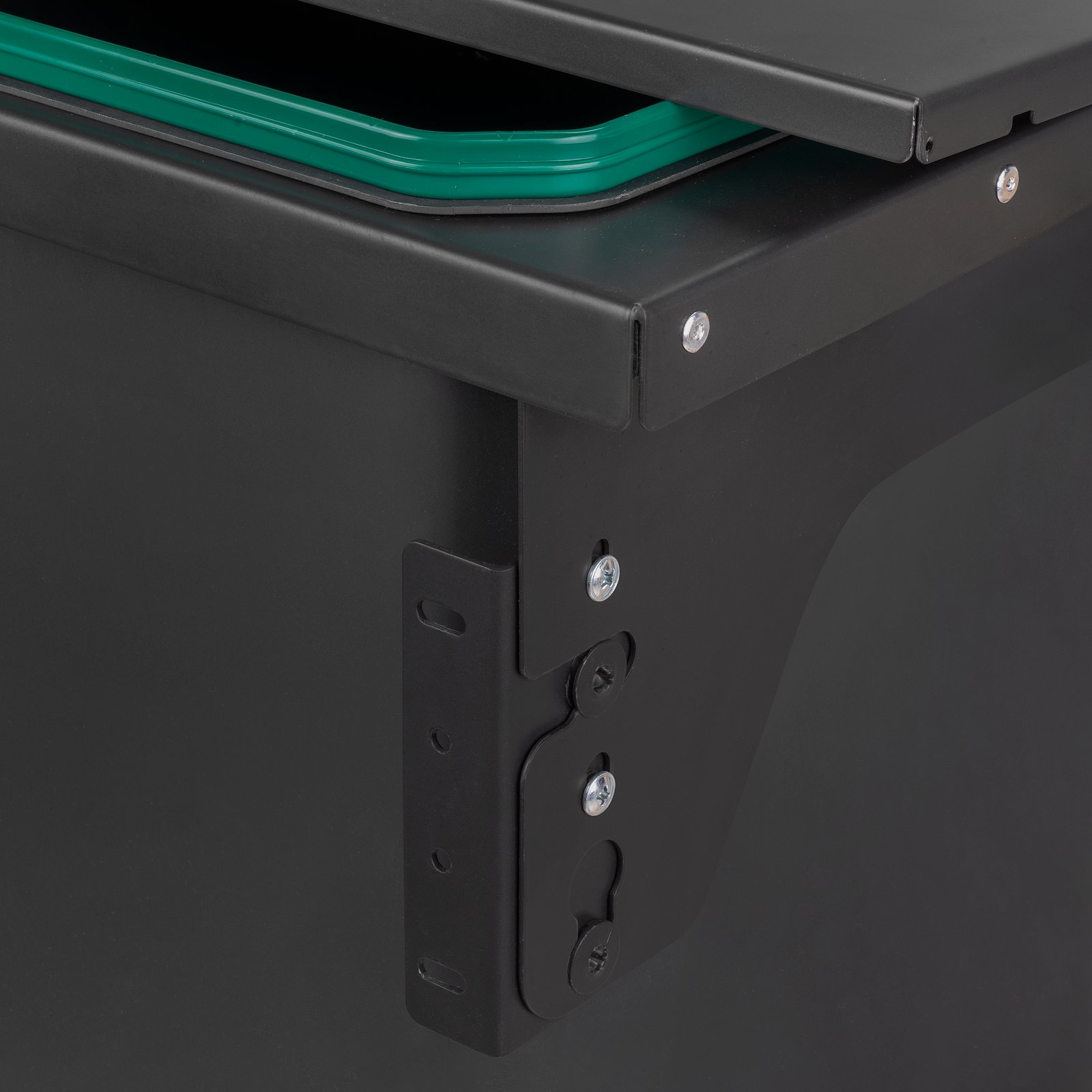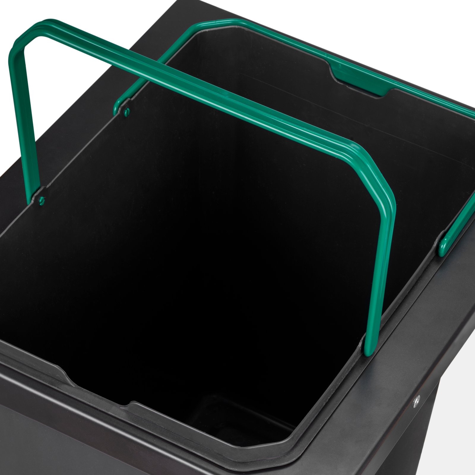 The bin has a 35-litre bin and incorporates a fixed steel lid which, in addition to covering the bins, acts as a shelf for the inside of the unit to store waste bags and lightweight accessories. The bin has a handle for easy removal and cleaning.