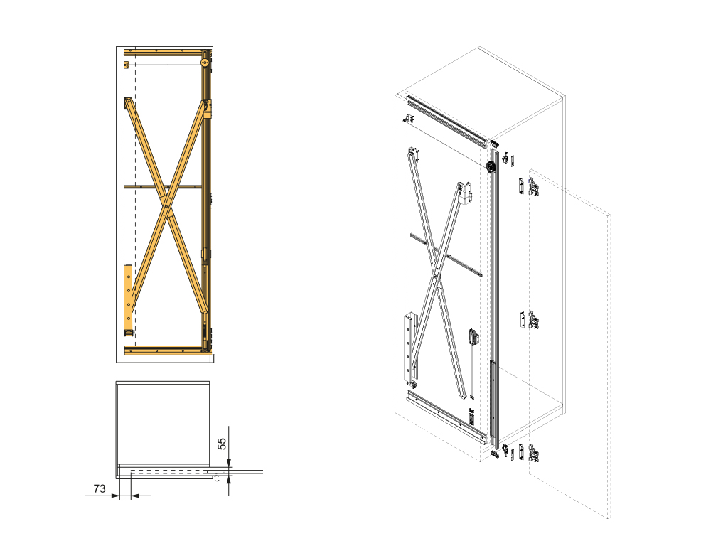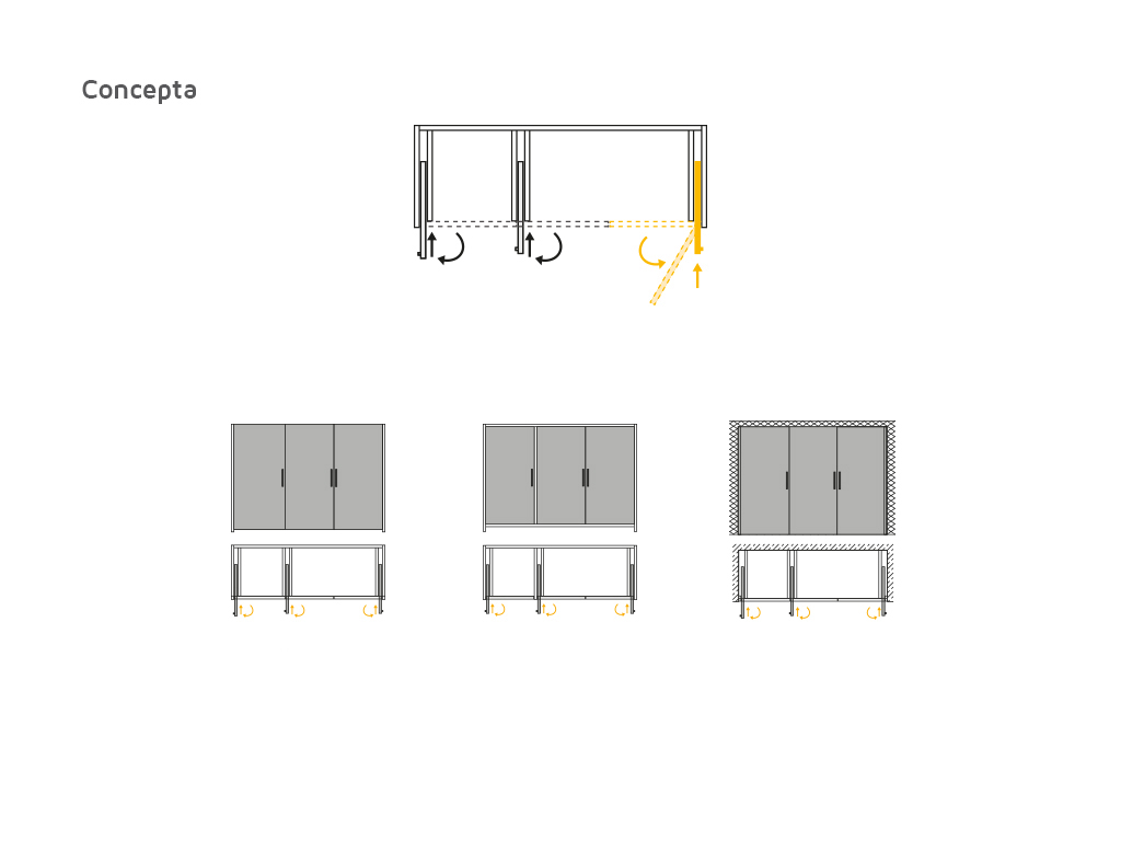 The Concepta hardware set is designed for concealed, hinged, and sliding door systems. It can be installed on modules or between walls, allowing to hide spaces or areas of the house or office with an aesthetic integrated within the set. It resists loads of up to 25 kg and is made of steel, aluminum, and plastic, for doors with a thickness of 19 to 50 mm and a height of 1250 to 1850 mm. It has a system to cushion the closing of the doors, preventing them from hitting. The packaging is one unit and includes all the necessary hardware for a door.