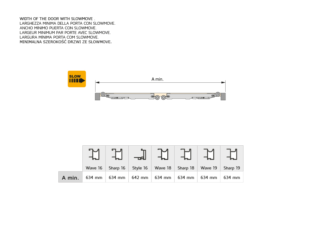 Slowmove door fittings is a set of parts used to install sliding smooth closure doors. The lower carriage is adjustable in height plus or minus 7.5 mm. Resist a weight up to 30kg. It has cushion bearings of Balls and an anti-derailment system using a dock in the lower car, with an adjustable anti-jump stop on the upper skate. The pieces of the kit are made of plastic. It is compatible with 16 mm, 18 mm and 10 mm boards. It has an exceeding upper brake that allows opening in either of the two senses. It works for 2 and 3 doors. Each packaging contains a totality of 2 units.
