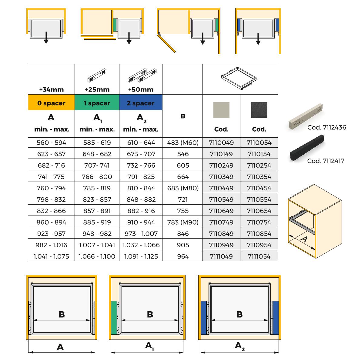 The side spacer set is designed for installation in cabinets with hinged or sliding doors in conjunction with the Hack pull-out frame. A spacer is required on the side of the cabinet where it coincides with the door and is installed where the slide goes. Its function is to leave a space of 25mm between the frame and the side of the cabinet so that the door does not collide with the frame.