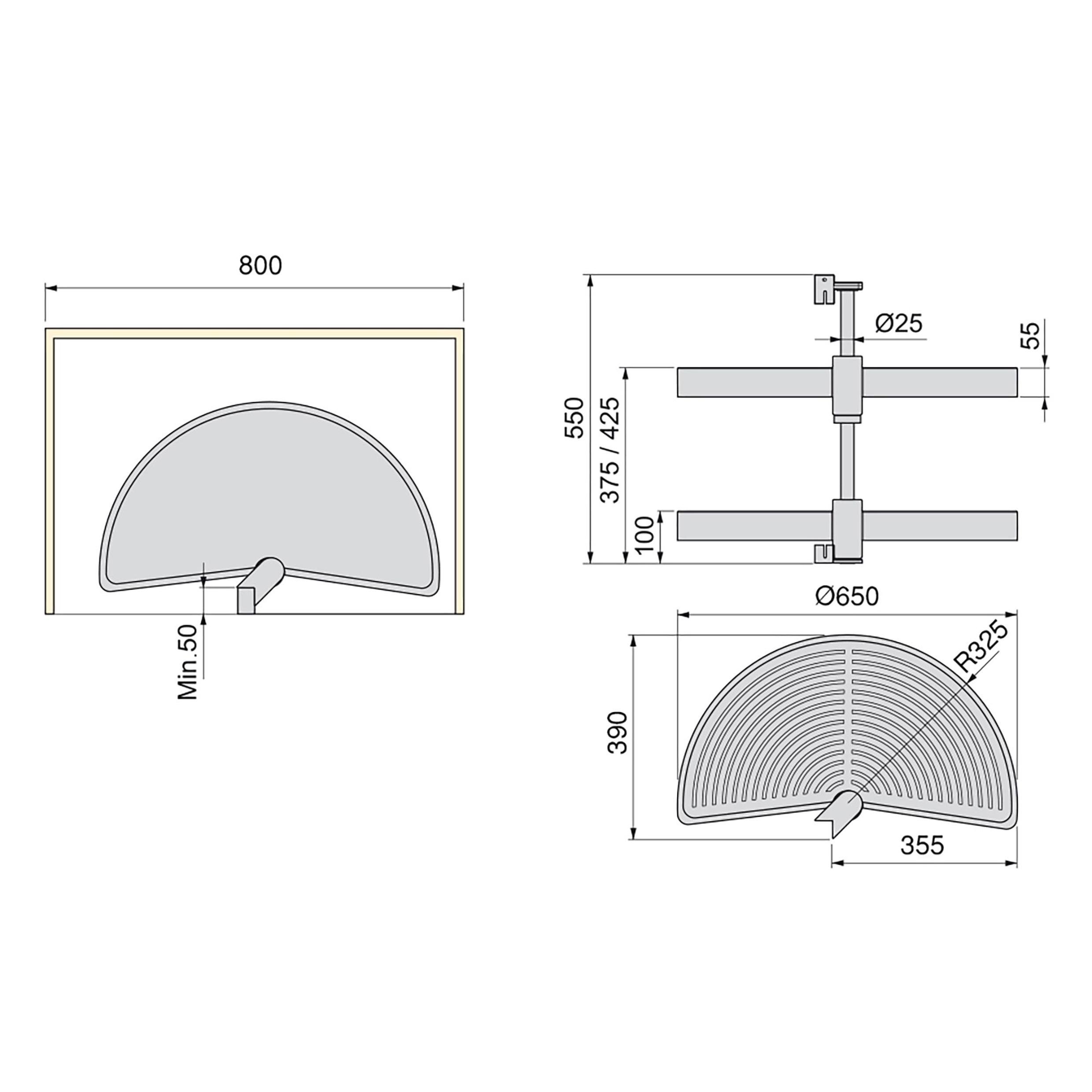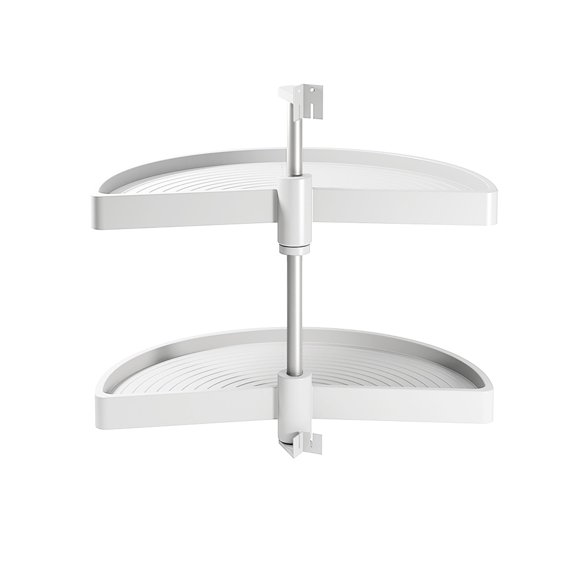 Half moon rotating trays designed to take advantage of space in L-shaped corner kitchen furniture. They are easy to install and adaptable to different module heights. They are available for measures of 800 mm and 900 mm modules and in white and gray finishes . The system consists of 2 trays and mounting accessories made of recyclable plastic, antistatic, high resistance to impacts and ultraviolet rays and a central bar of aluminum matte anodized finish. They have a load capacity of 20kg per tray .