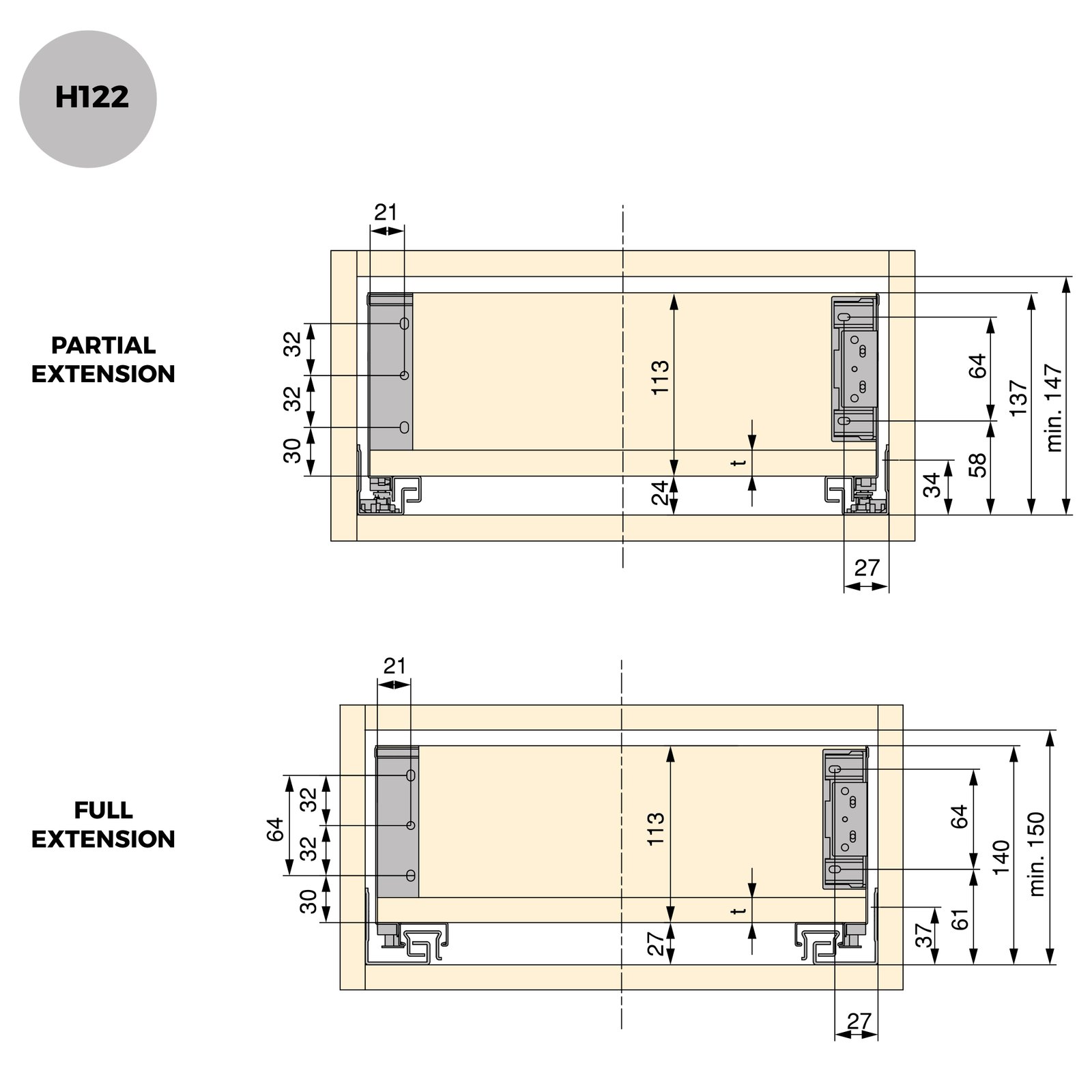For assembly it is necessary to purchase the pair of Silver runners, with a choice of partial or total pull-out Silver runners and partial Push runners depending on the customer’s needs or requirements. The load capacity will depend on the runners chosen, being 25 kg (partial pull-out) or 30 kg (total pull-out).