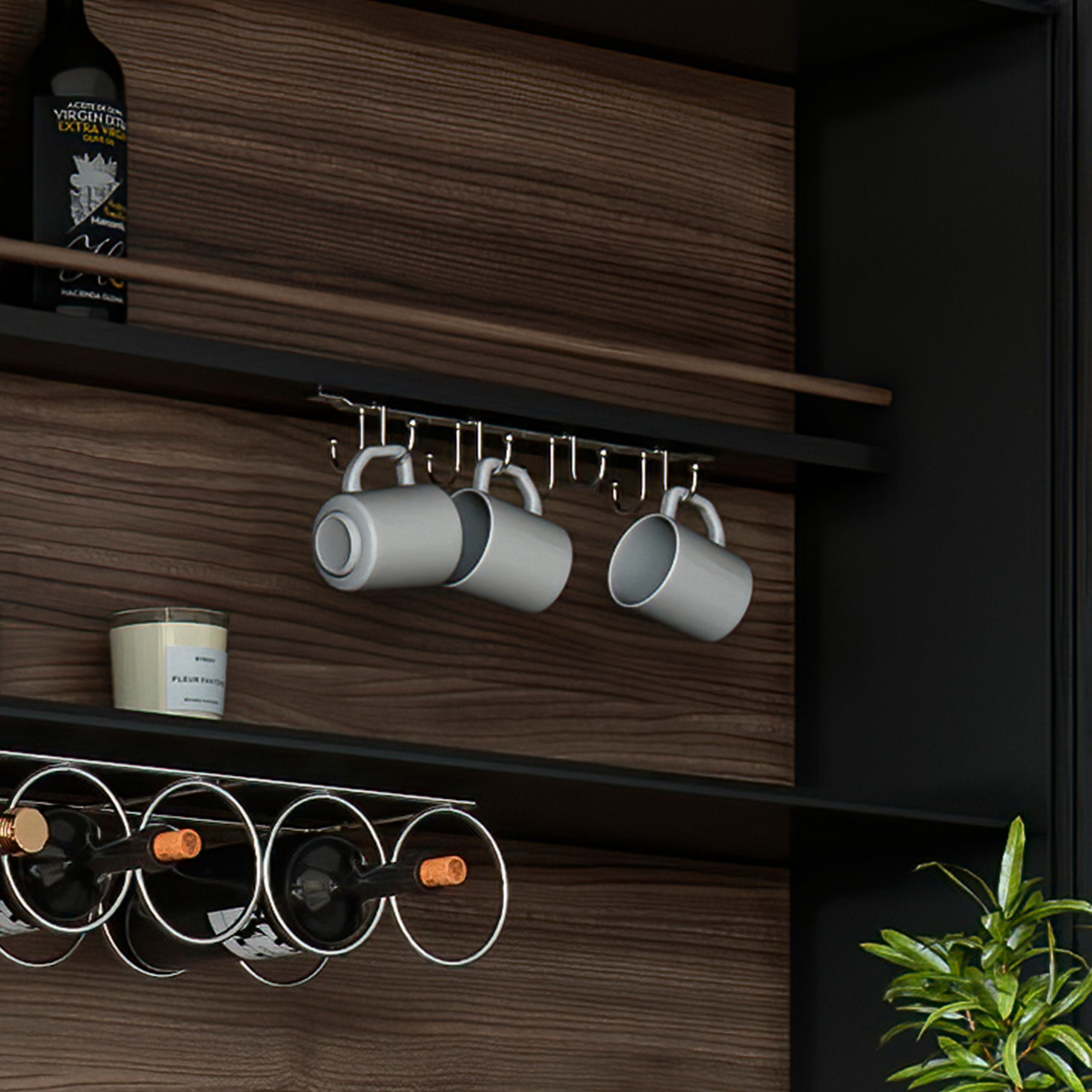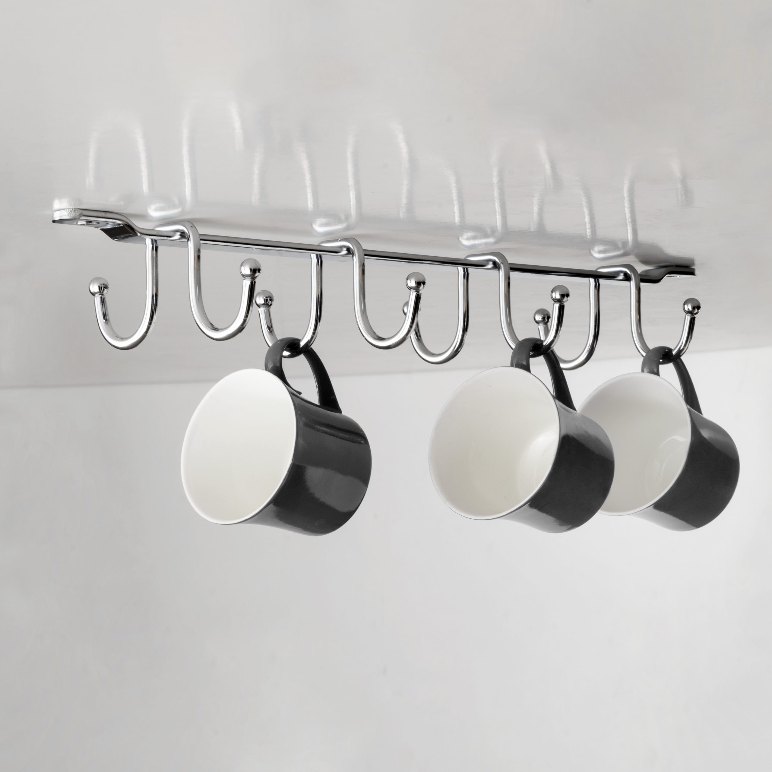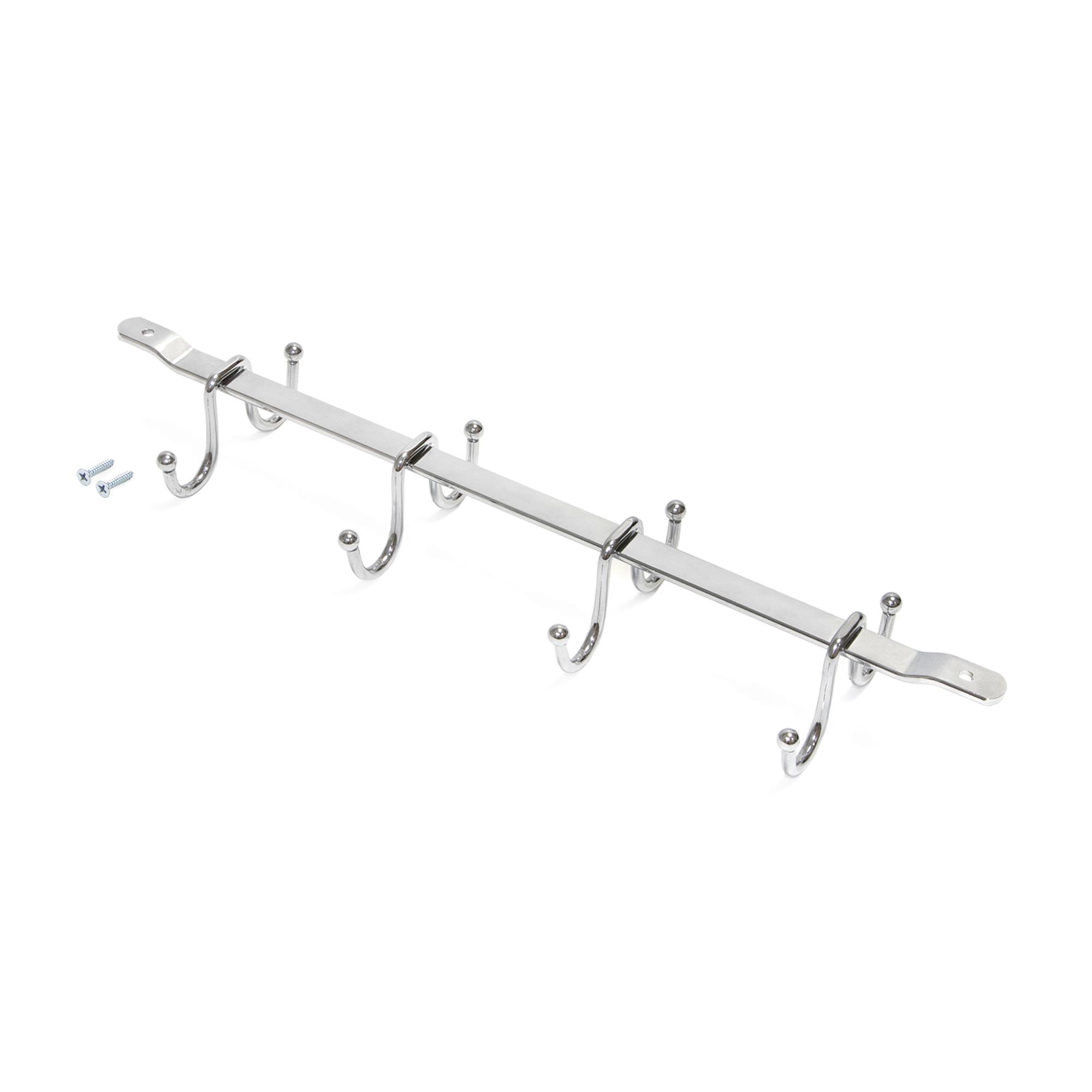 Cup hanger with 8 hooks for kitchen units. It is a hanger that will help you organize your kitchenware, optimizing the space available inside your units, under shelves or counters in your home, kitchen, bar or restaurant. Its wire frame design in chrome-plated steel will adapt to any kitchen style. It is easy to install in your units using the screws provided.