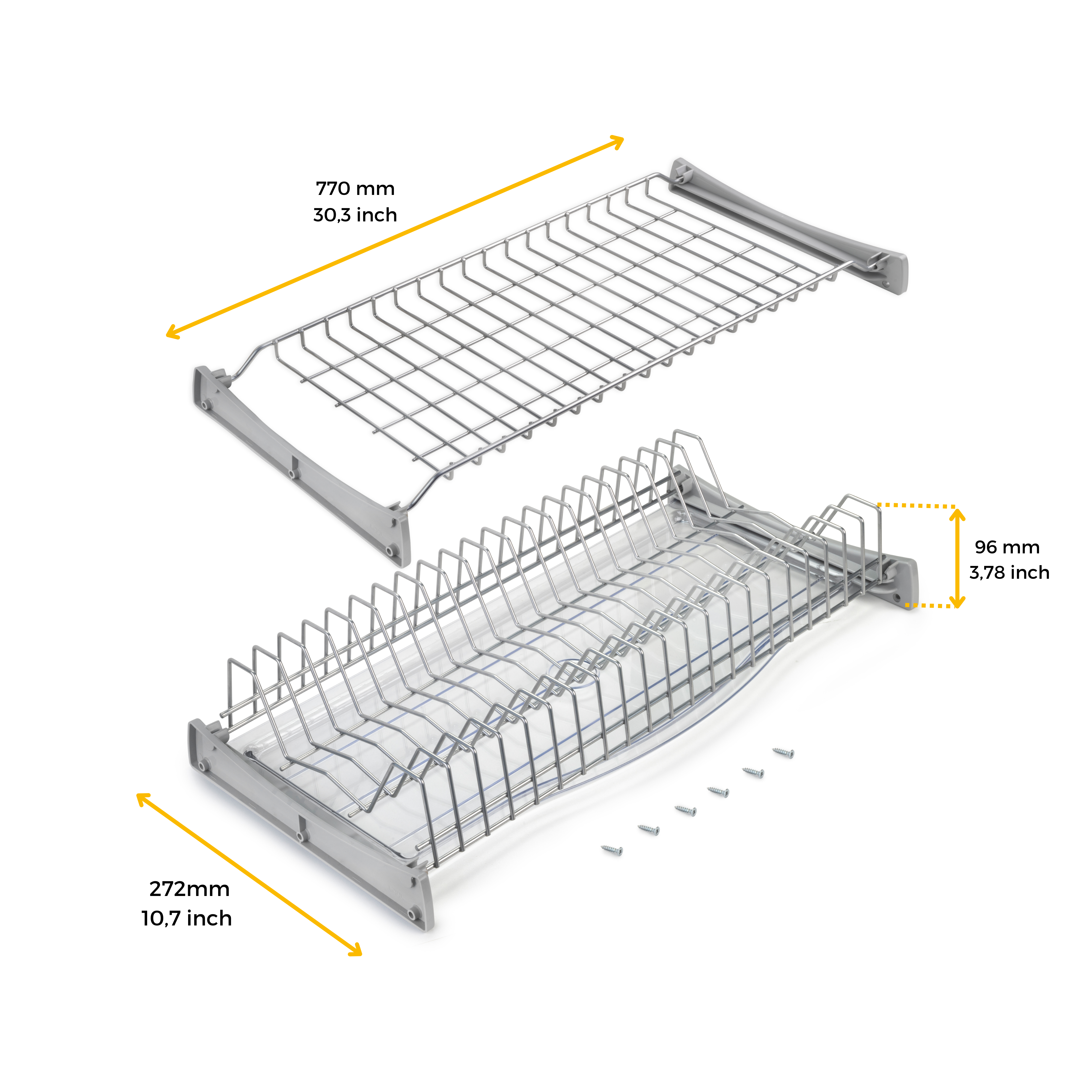 It stands out for its large storage capacity and for being very easy to assemble, you only have to screw the anchors into the kitchen unit and place the trays. Made of steel with a rust-resistant aluminium painted finish, with grey plastic anchors to the unit and transparent plastic drip tray.