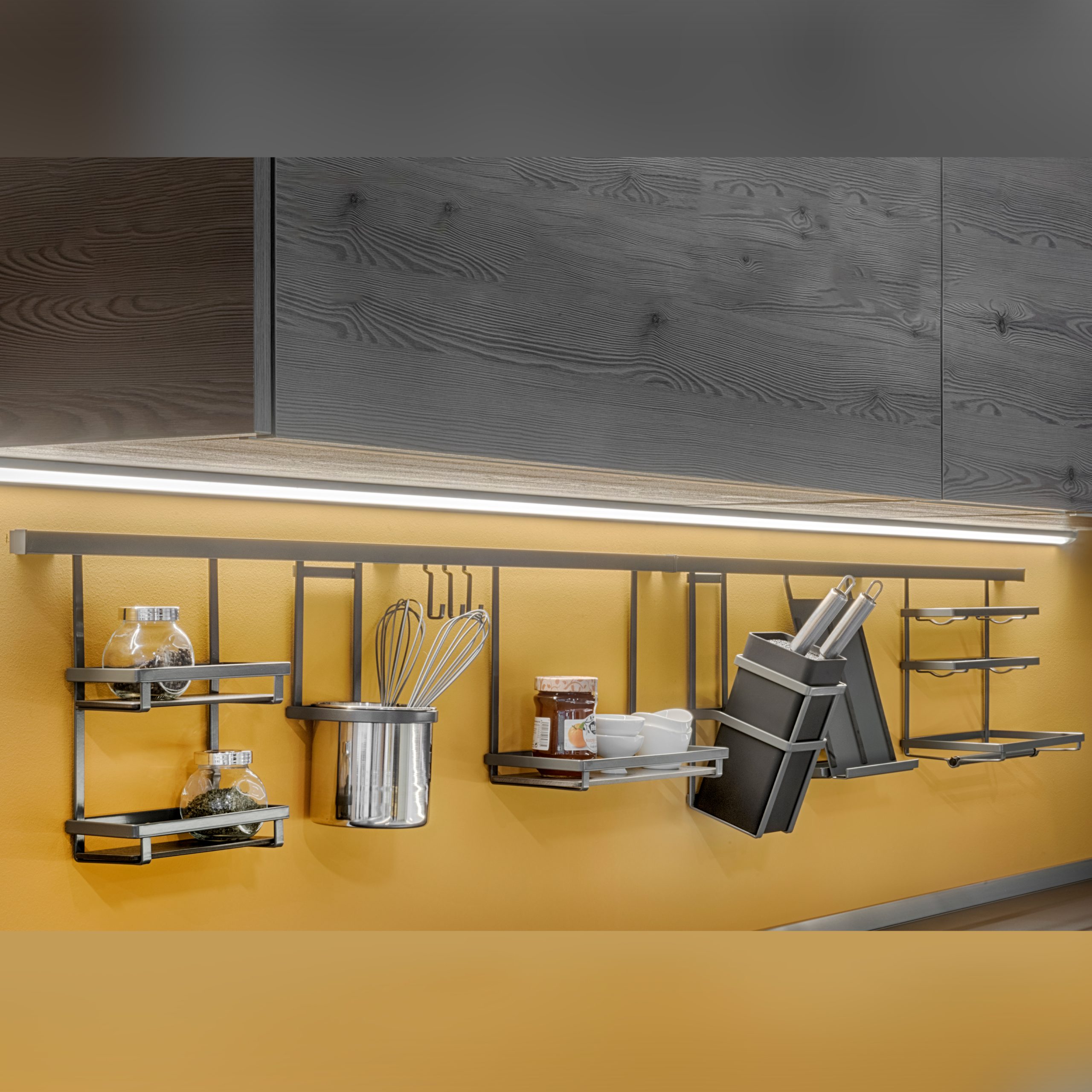 Range of accessories to mount in your kitchen wall. Now you will have all your tools at hand’s reach and more room in the kitchen counter to work as if you were in a big restaurant. Its elegant design in anthracite grey and its flat steel structure are the latest trends in kitchen design. Charaterised by being suspended from an aluminium profile fitted to the wall with hidden supports. The different accesories hang from the back side of the profile obtaining a clean look. Different accessories are available with their optimized dimensions to make the most of their storage capacity. The wide range includes utensil racks, spice jar racks and hanging hooks. Also a practical roll holders for kitchen paper towels, cling film and aluminium foil, a chromed cutlery holder, knife holder and a tablet stand to follow recipes in an easy and safe manner in the kitchen.