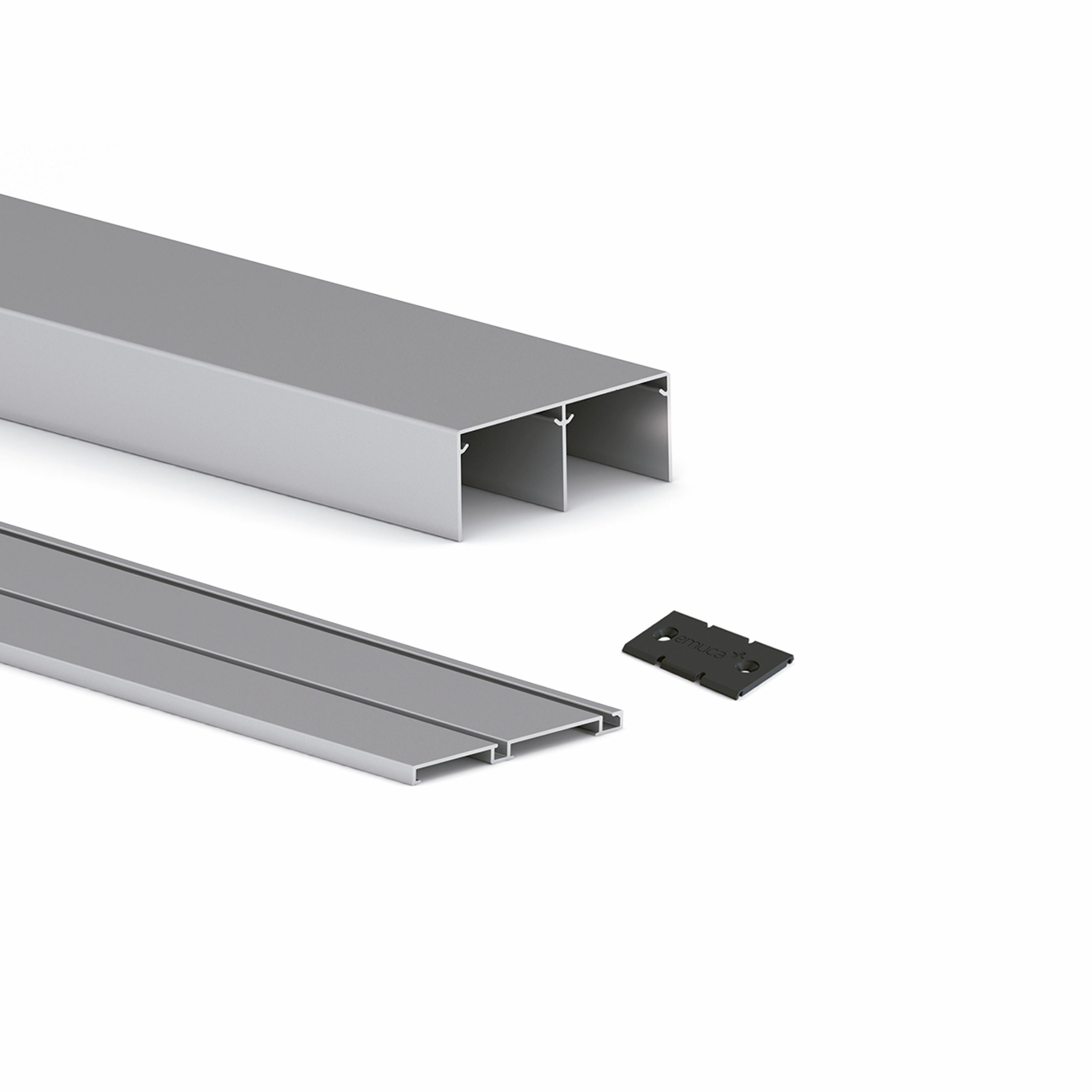 The Placard 74 channel set for Clip flush channel contains 1 upper 74 mm x 34 mm rail + 1 lower 74 mm x 6 mm flush rail + 3 clips. All this set belongs to the Placard 74 line and can be used with all the essential products of this model. Each component is made of sturdy aluminum with a white paint finish and the clip is made of strong plastic. This set of rails supports both the slow system and the normal system of trolleys and skids, and can also be used with 16 mm, 18 mm, and 19 mm boards. Its packaging contains 1 set of rails + clip.