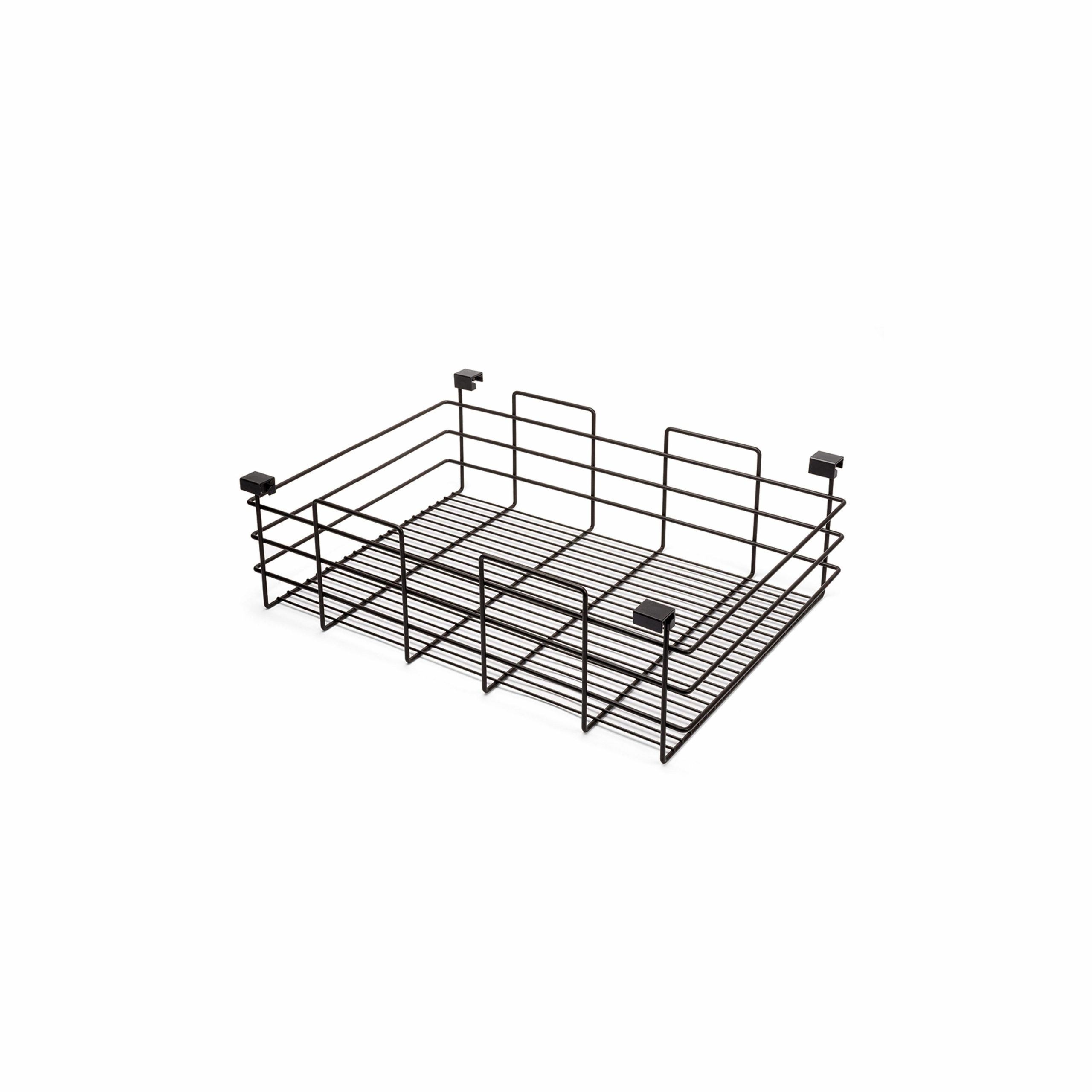 Wardrobe basket made entirely of stainless steel wire welded together for better strength and durability. Finished in mocha color with RAL 8019, to stand out with the wood. In the packaging come two units of this drawer totally ready to use, with dimensions 201 mm high, 458 mm deep. The width brings three alternatives: 475 mm, 675 mm, and 775 mm. Its wire design features 4 tabs, one at each corner, allowing it to be used as a closet drawer with any support.
